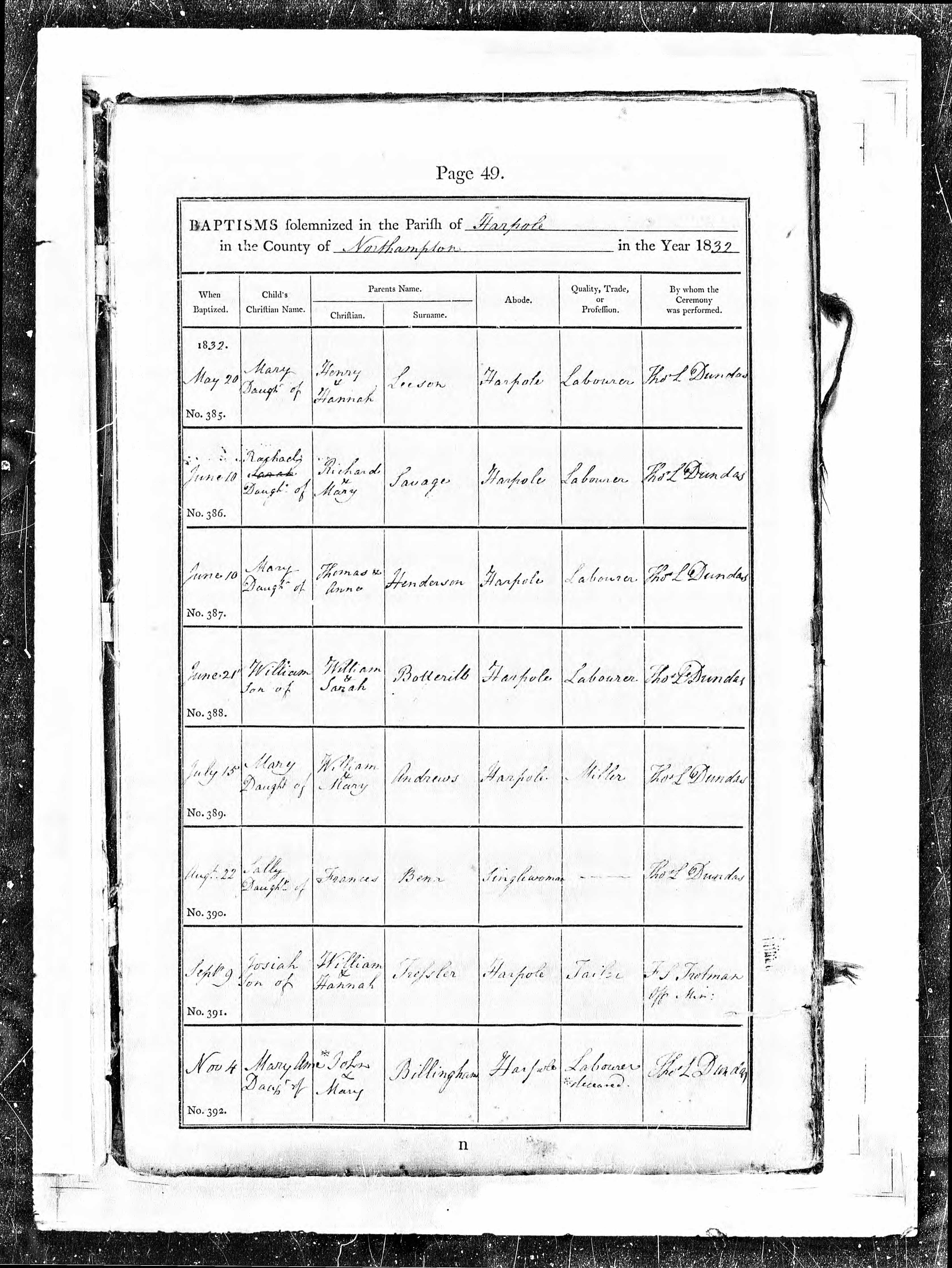 Parish Registers of All Saints, Harpole, Northamptonshire; Baptism entry for Mary Andrews, 15 Jul 1832, Page 49, No 389.