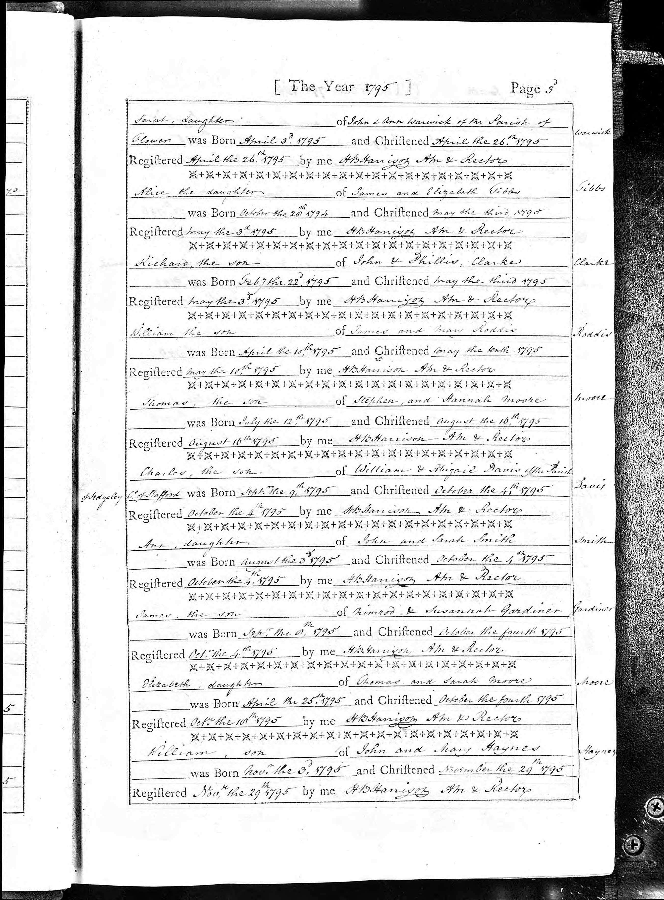 Parish Registers of St Michael, Bugbrooke, Northamptonshire; Baptism entry for Richard Clarke, 3 May 1795, Page 3.