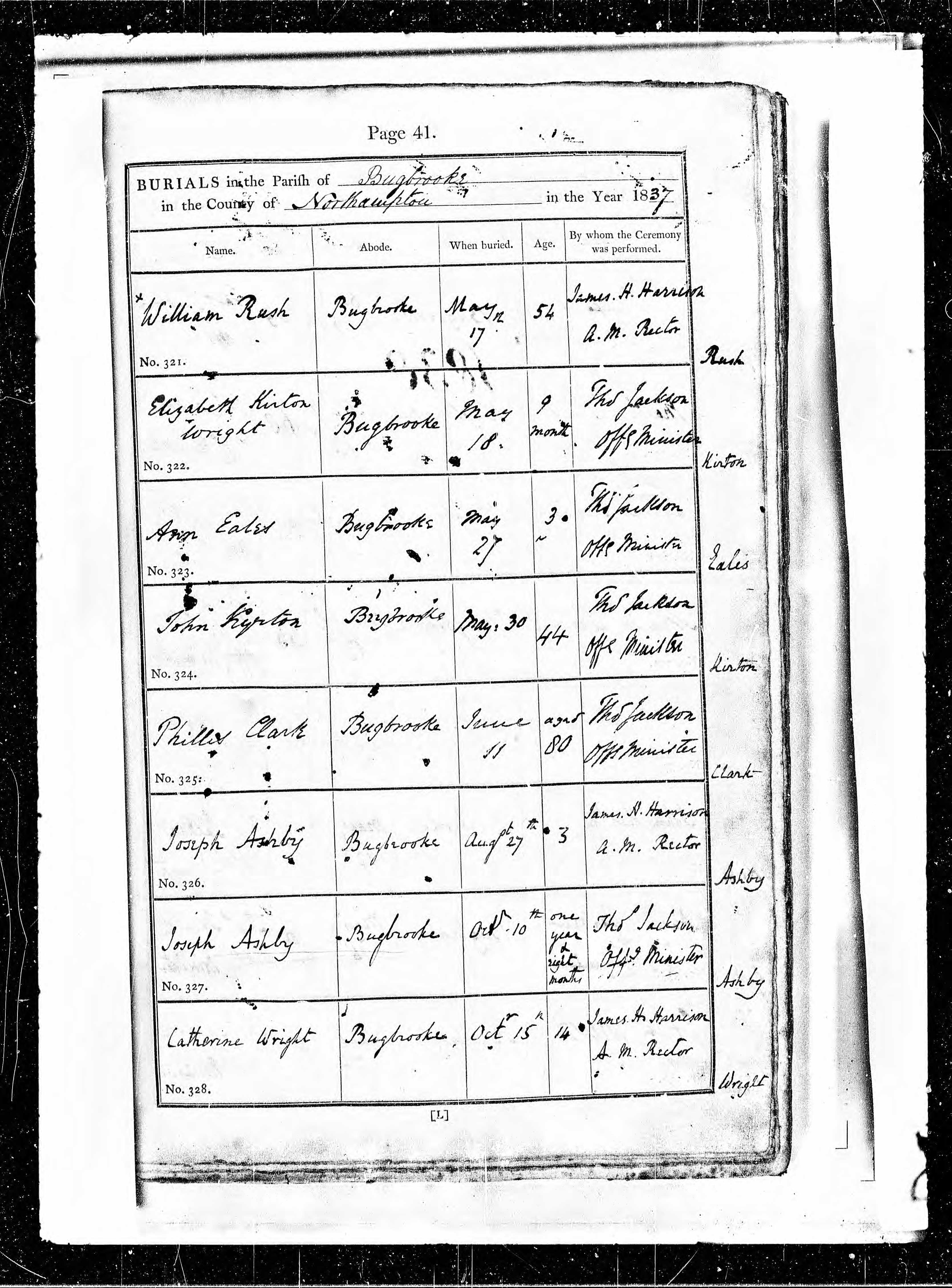Parish Registers of St Michael, Bugbrooke, Northamptonshire; Burial entry for Phillis Clark, 11 Jun 1837, Page 41, No 325.