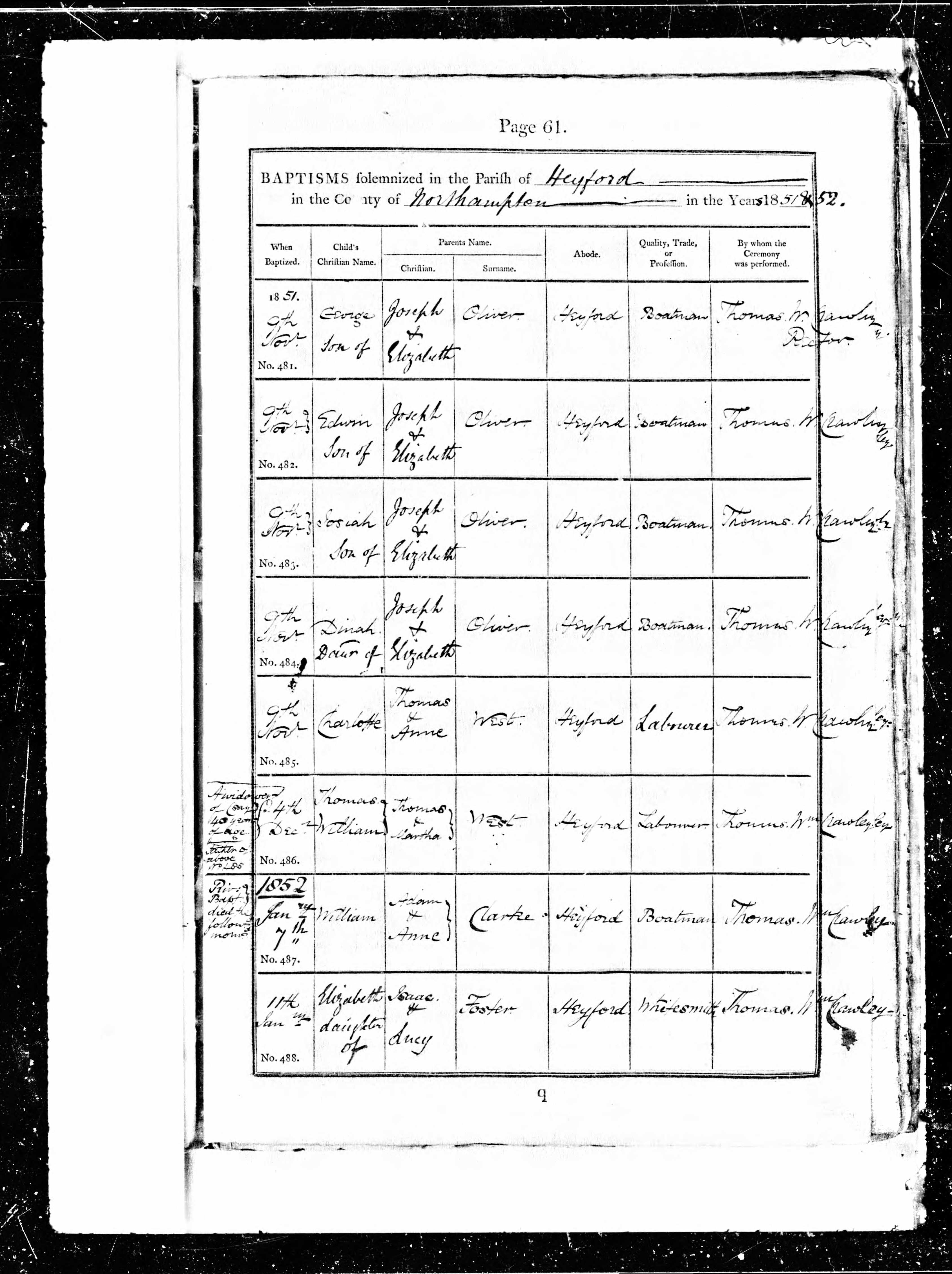 Parish Registers of St Peter & St Paul, Heyford, Northamptonshire; Baptism entry for William Clarke, 7 Jan 1852, Page 61, No 487.