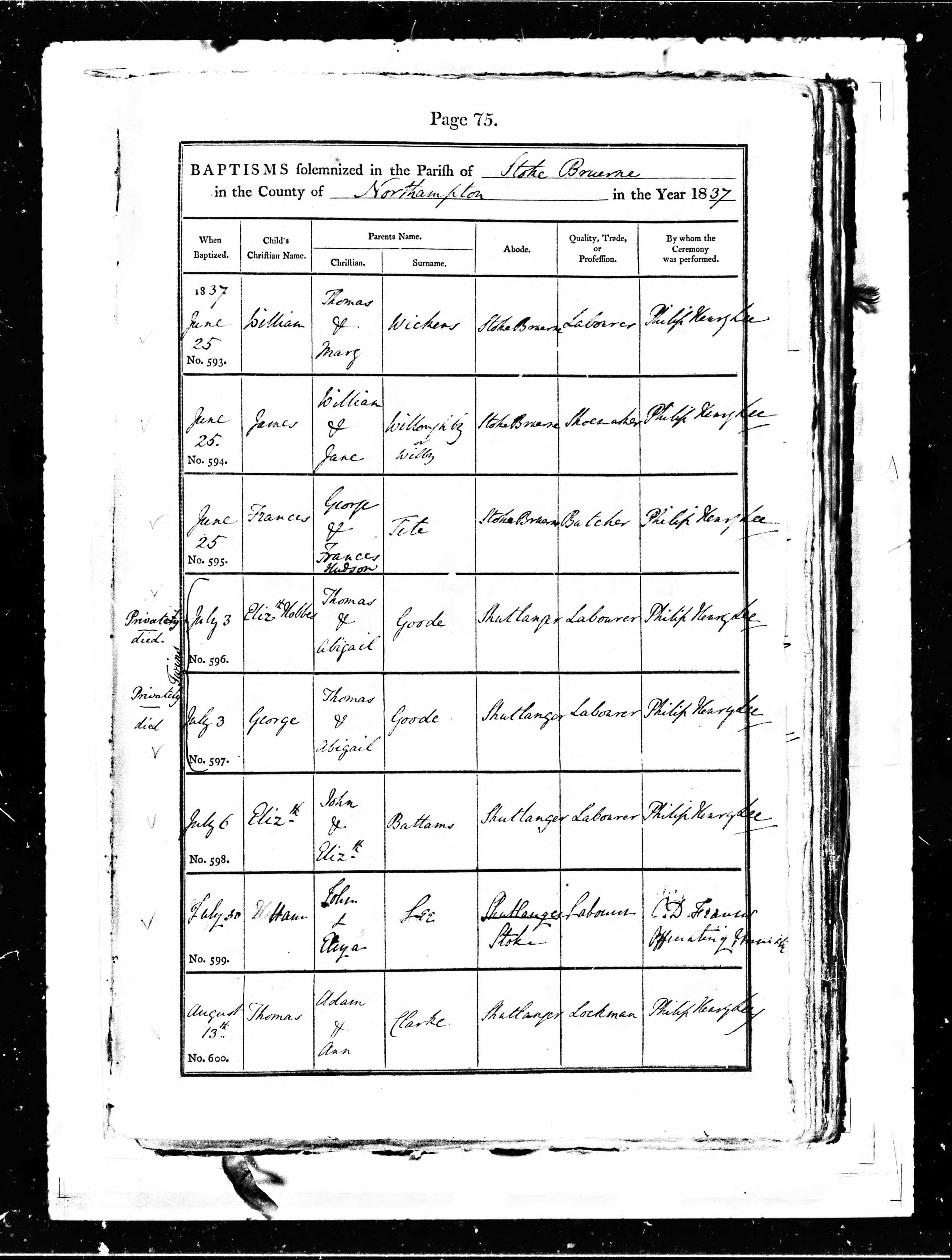 Parish Registers of St. Mary the Virgin, Stoke Bruerne, Northamptonshire; Baptism entry for Thomas Clarke, 13 Aug 1837, Page 75, No 600.