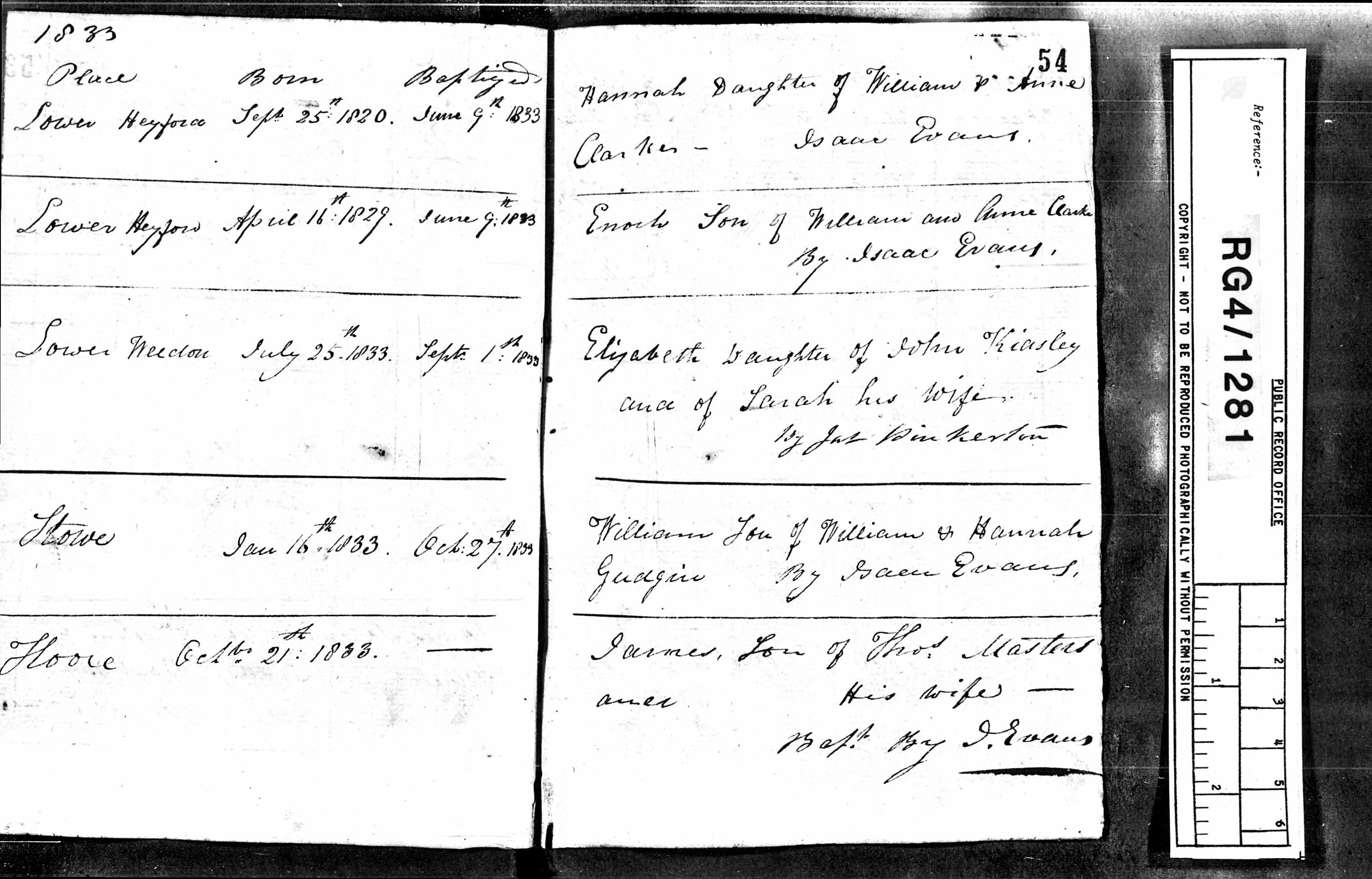 Register of Births and Baptisms for the Independent Weedon and Floore Chapels, Northamptonshire; Baptism entry for Enoch Clarke, 9 Jun 1833, Folio 54.