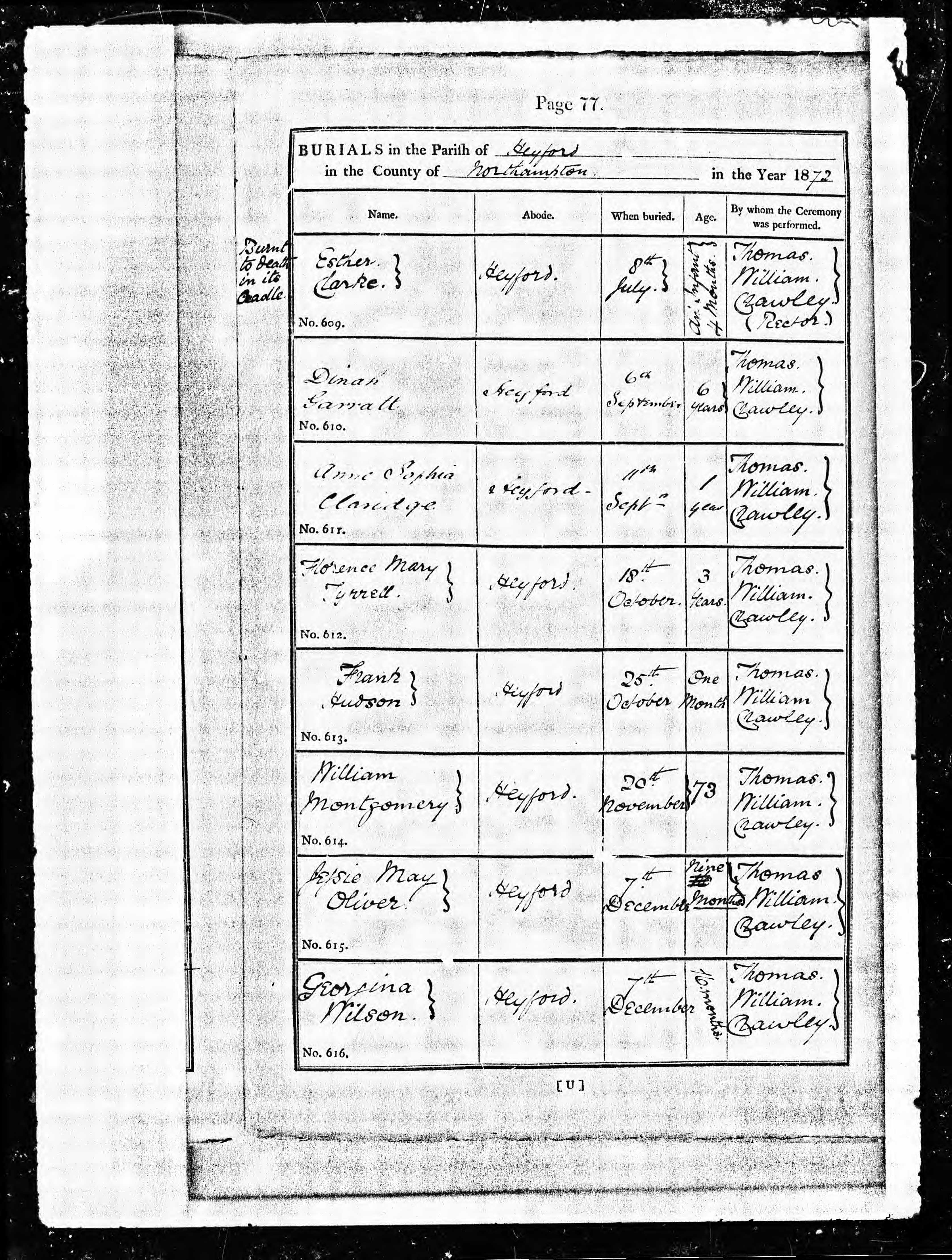 Esther Clarke, abode Heyford, an infant 4 months, burnt to death in its cradle