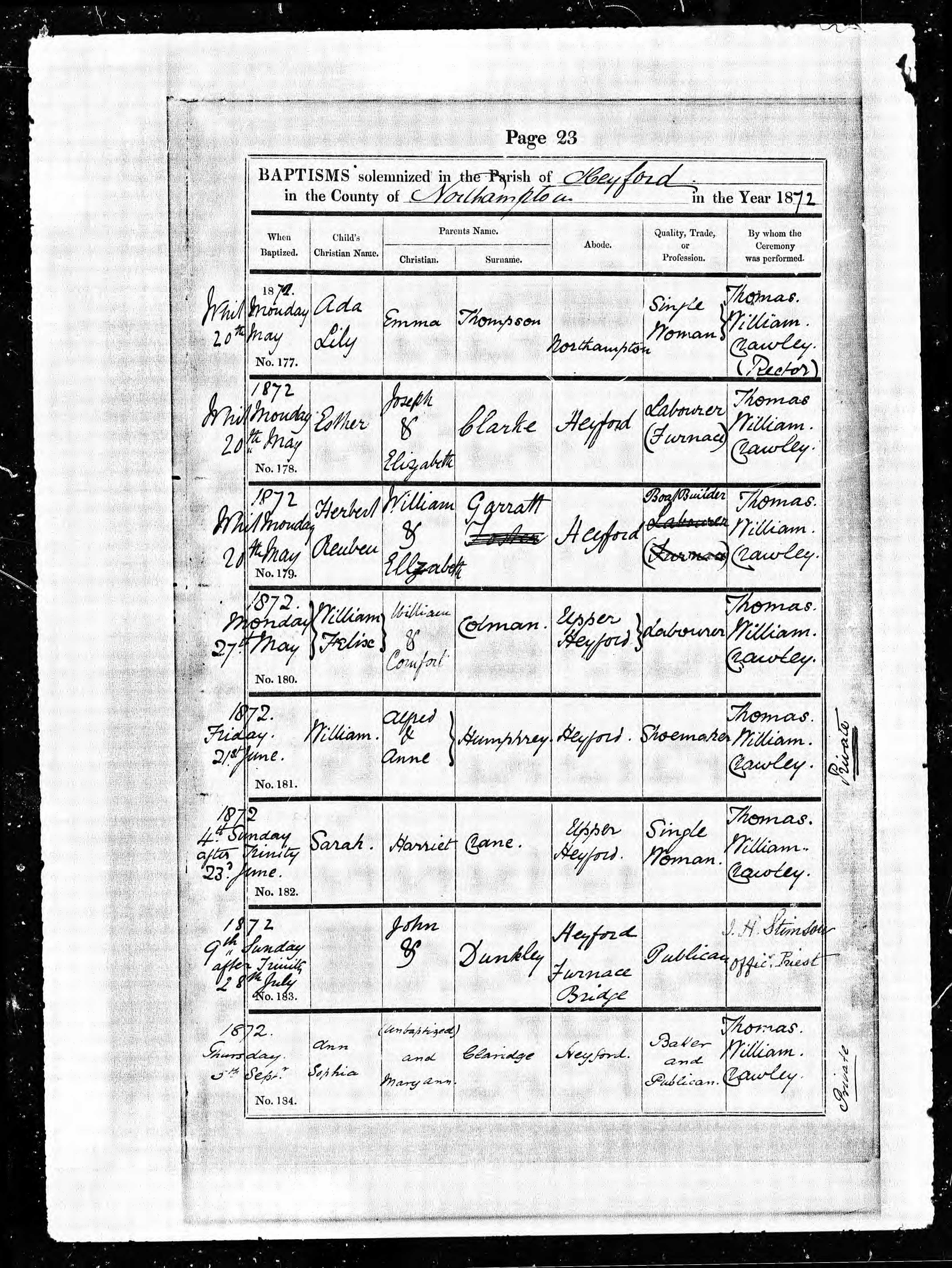 Parish Registers of St Peter & St Paul, Heyford, Northamptonshire; Baptism entry for Esther Clarke, 20 May 1872, Page 23, No 178.