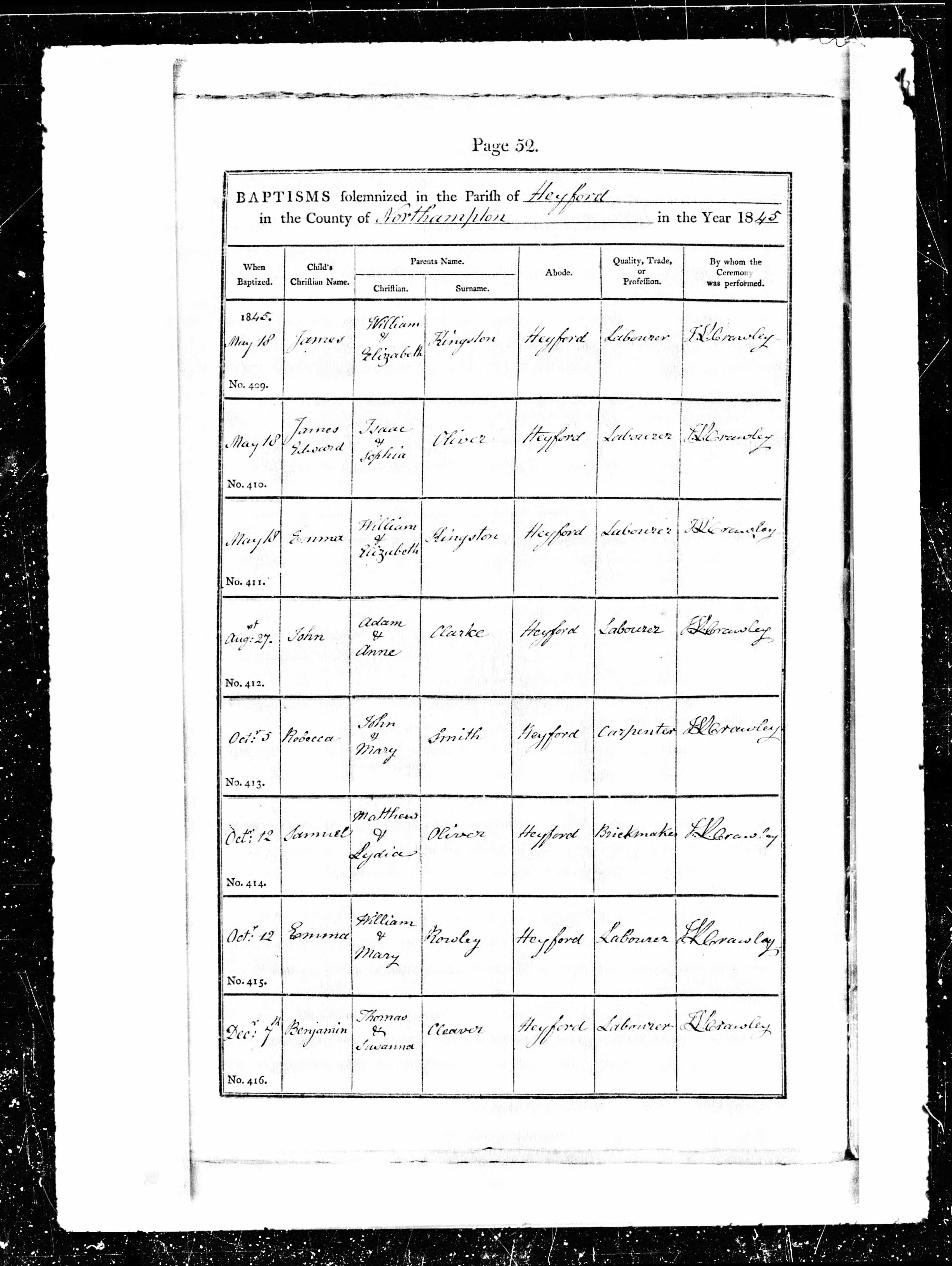 Parish Registers of St Peter & St Paul, Heyford, Northamptonshire; Baptism entry for John Clarke, 27 Aug 1845, Page 52, No 412.