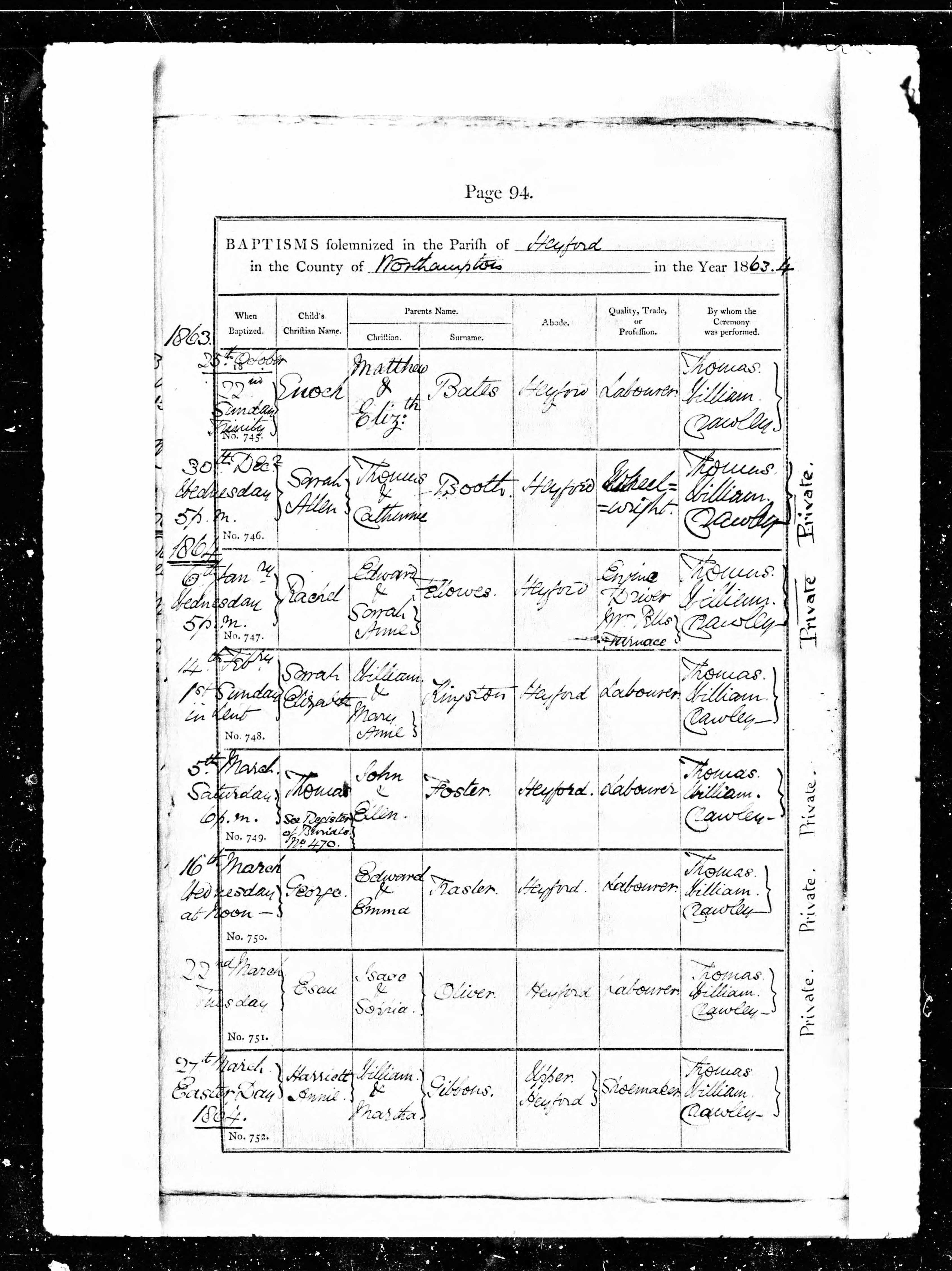 Parish Registers of St Peter & St Paul, Heyford, Northamptonshire; Baptism entry for Enoch Bates, 25 Oct 1863, Page 94, No 745.