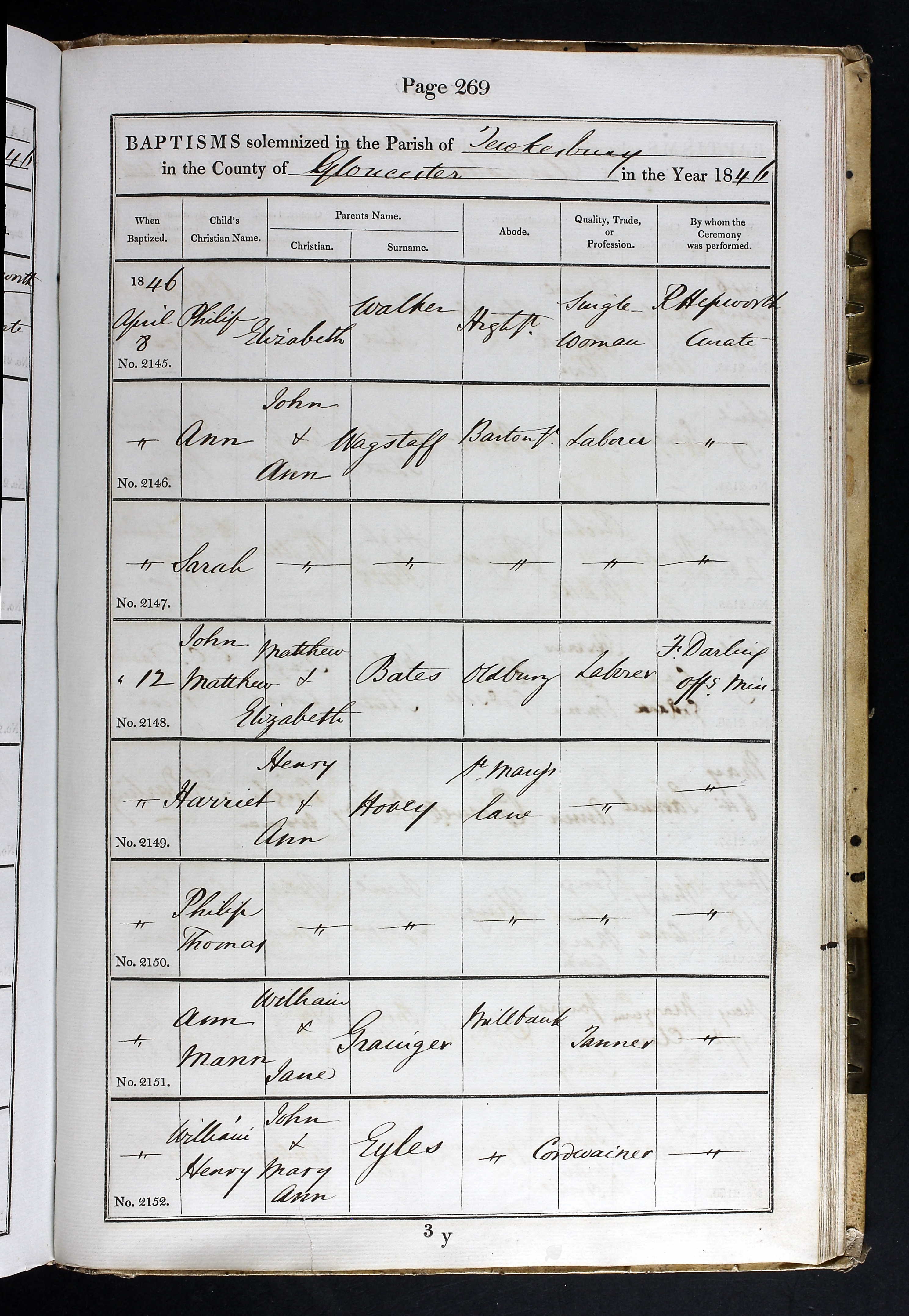 Parish Registers of St. Mary, Tewkesbury, Gloucestershire; Baptism entry for John Matthew Bates, 12 Apr 1846, Page 269, No 2148.