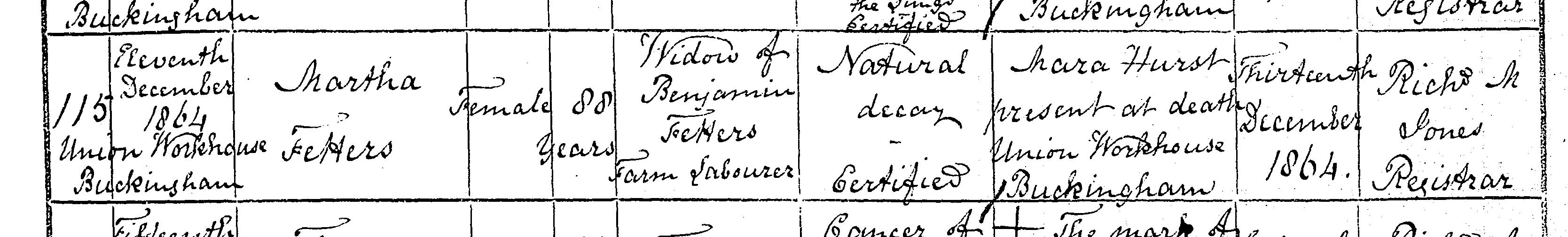 Death in the Registration District of Buckingham, Buckinghamshire, 1864, no. 115. Died 11 Dec 1864 at Union Workhouse, Buckingham; Martha Fetters; Female; age 80; Widow of Benjamin Fetters, Farm Labourer. Cause of death: Natural decay; certified. Informant was [M?S?]ara Hurst (signed name); residing at Union Workhouse, Buckingham; present at death. The death was registered 13 Dec 1864.