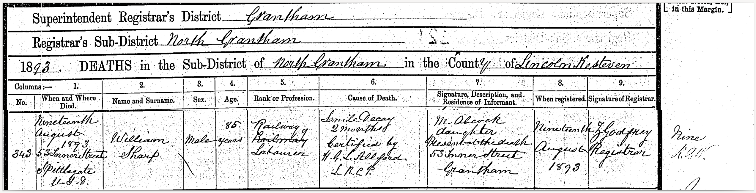 Death in the Registration District of Grantham, Sub-district of North Grantham, Lincoln Kesteven, 1893, no. 343. Died 19 Aug 1893 at 54 Inner Street, Spittlegate; William Sharp; Male; age 85; Railway Labourer. Cause of death: Senile Decay 2 months; certified. Informant was M. Alcock (signed name); relation: Daughter; residing at 53 Inner Street, Grantham; present at death. The death was registered 19 Aug 1893.