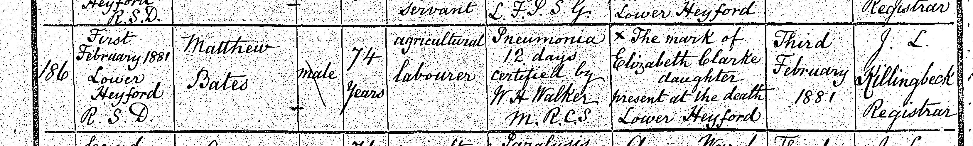Death in the Registration District of Northampton, Northamptonshire, 186, no. 186. Died 1 Feb 1881 at Lower Heyford; Matthew Bates; Male; age 74; Agricultural Labourer. Cause of death: Pneumonia 12 days; certified. Informant was Elizabeth Clarke (could not sign name); relation: Daughter; residing at Lower Heyford; present at death. The death was registered 3 Feb 1881.
