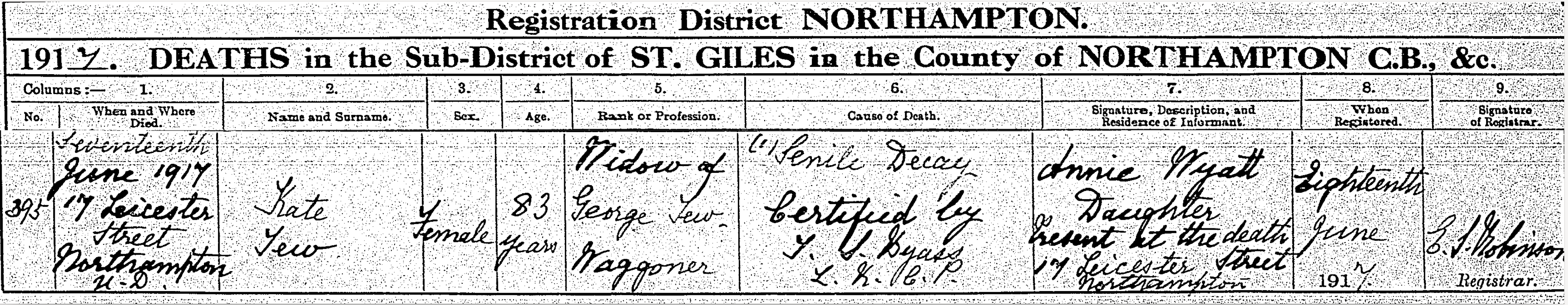 Death in the Registration District of Northampton, Sub-district of St. Giles, Northampton, 1917, no. 395. Died 17 Jun 1917 at 17 Leicester Street, Northampton; Kate Tew; Male; age 83; Widow of George Tew, waggoner. Cause of death: Senile decay; certified. Informant was Annie Wyatt (signed name); relation: Daughter; residing at 17 Leicester Street, Northampton; present at death. The death was registered 18 Jun 1917.