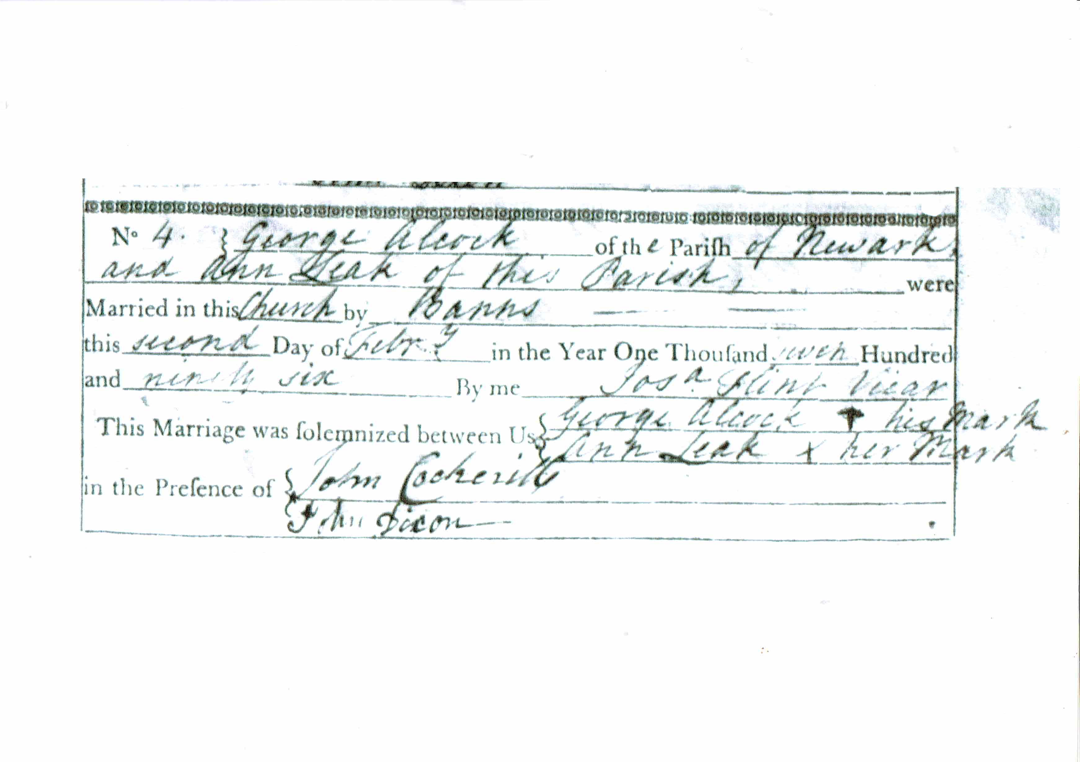 - George Alcock★ and Ann Leak★ was married on 2 Feb, 1796 in Clarborough, Nottinghamshire, England