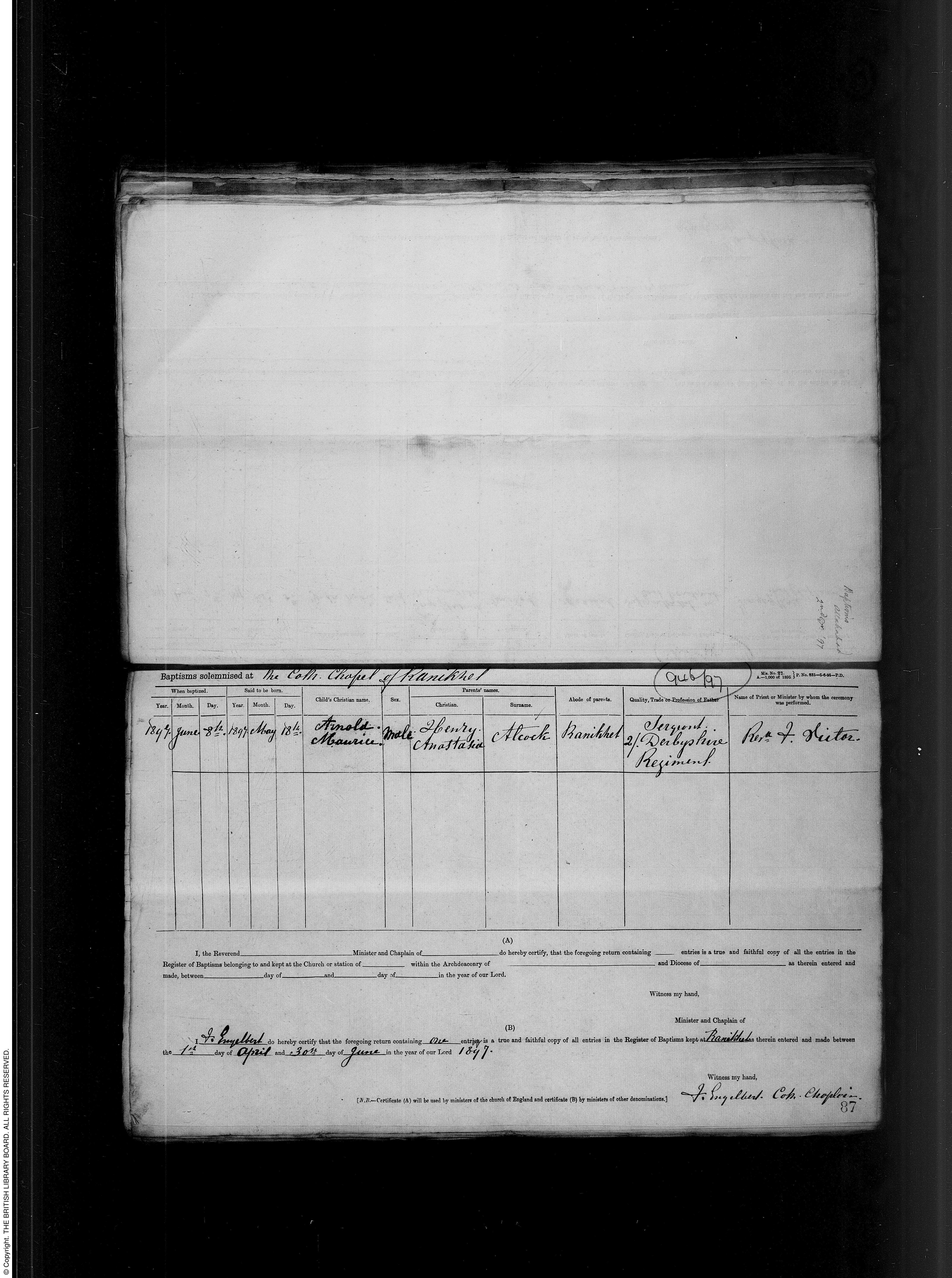 Baptism entry for Arnold Maurice Alcock, The Cath Chapel of Ranikhet, 8 Jun 1897, Image Group Number 5137589, Image 00098, Page 87