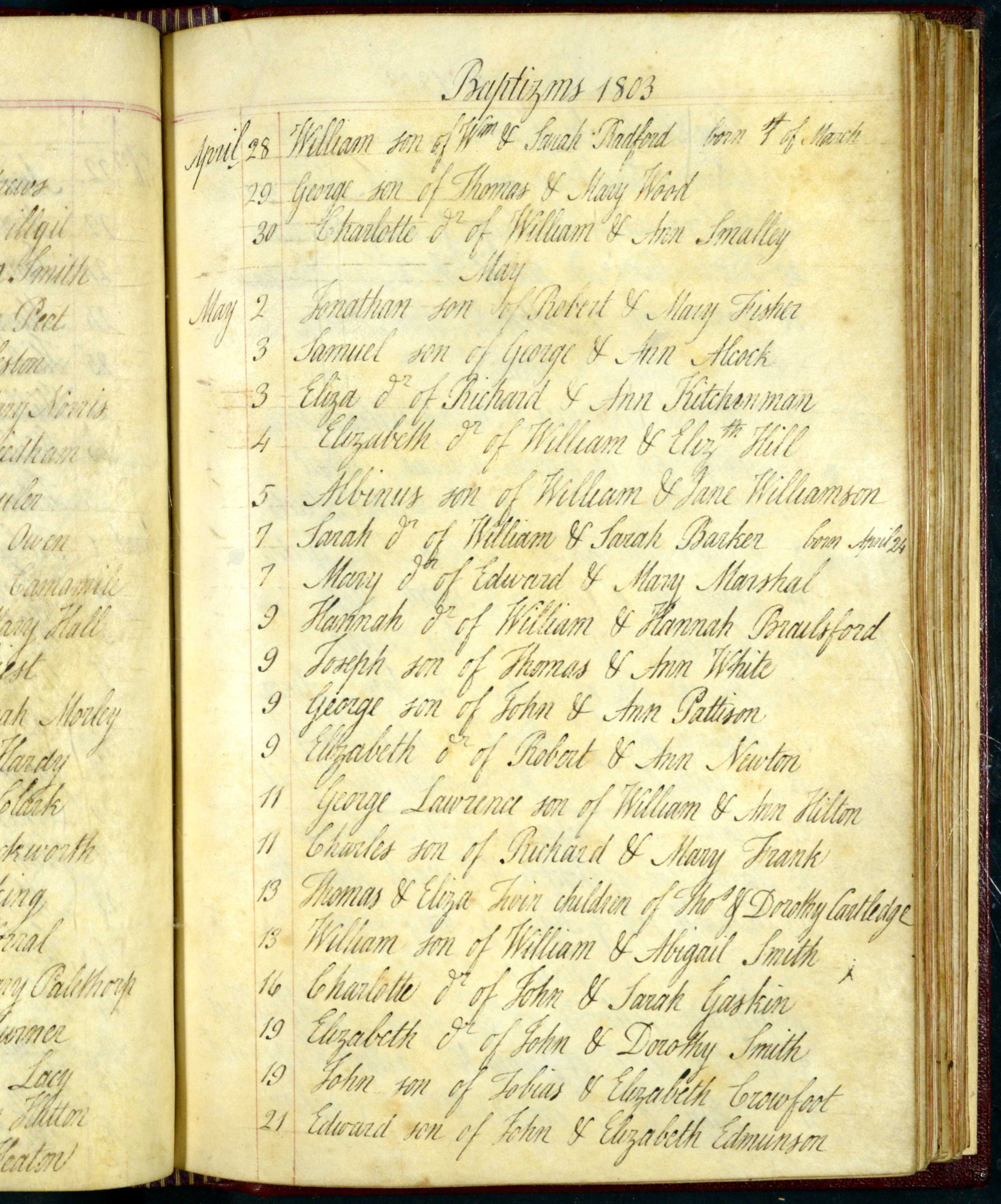 Parish Registers of St. Mary Magdalene, Newark, Nottinghamshire; Baptism entry for Samuel Alcock, 3 May 1803.