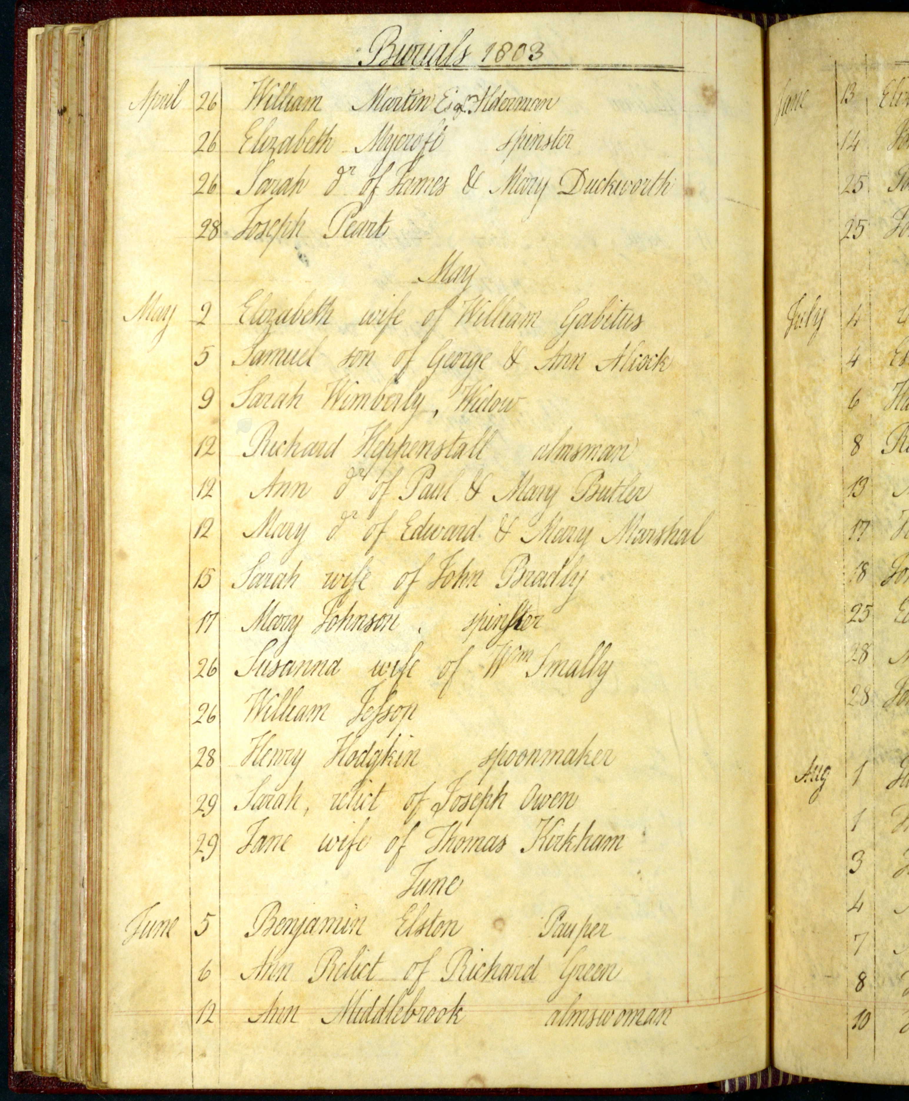 Parish Registers of St. Mary Magdalene, Newark, Nottinghamshire; Burial entry for Samuel Alcock, 5 May 1803.
