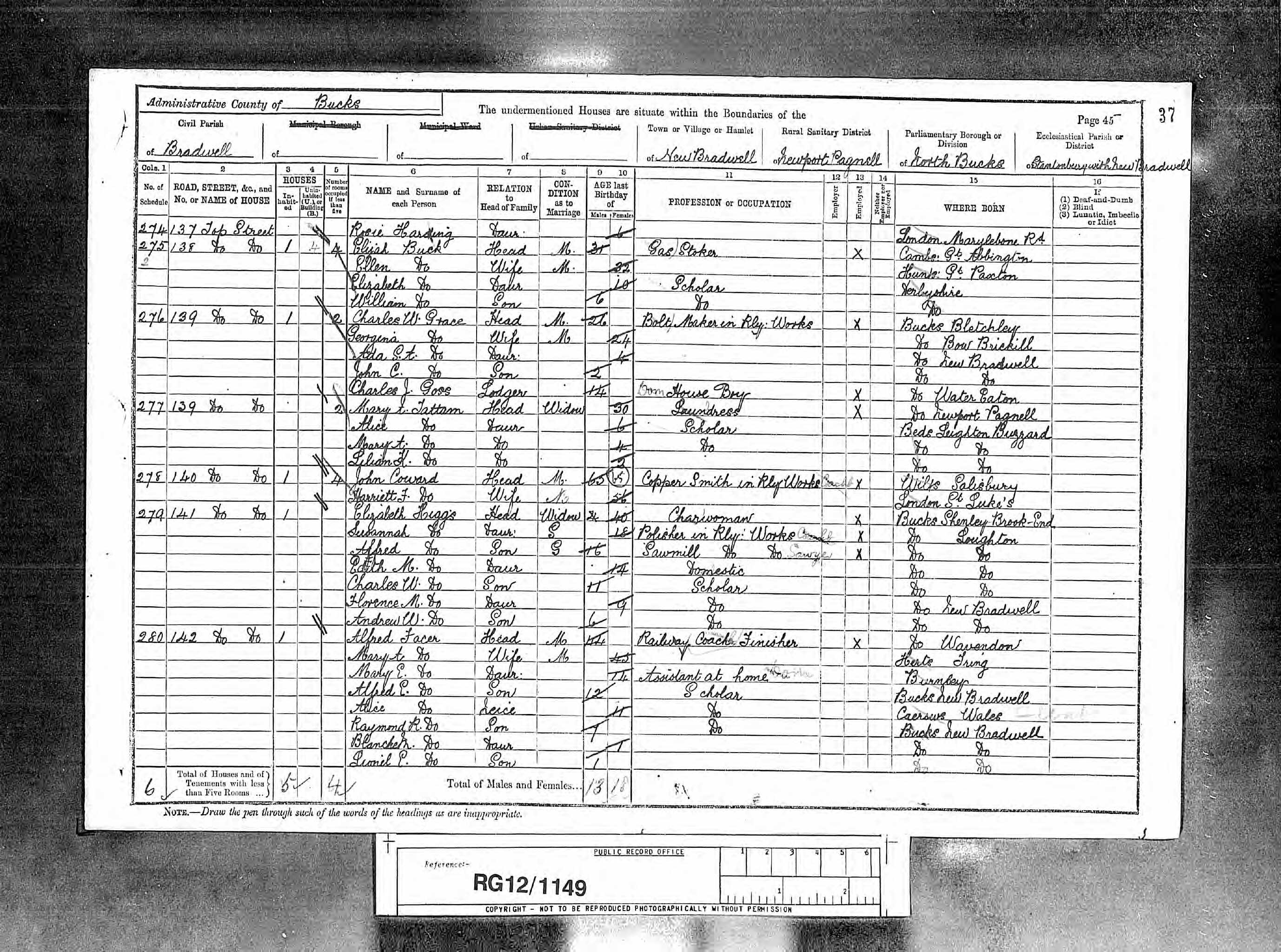 - was recorded in the census on 5 Apr, 1891 at 142 Top Street, New Bradwell, Buckinghamshire, England