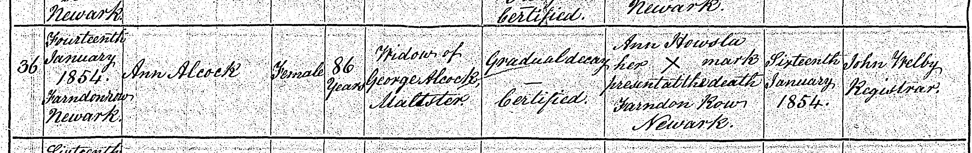 Death in the Registration District of Newark, Nottinghamshire, 1854, no. 36. Died 14 Jan 1854 at Farndon Row, Newark; Ann Alcock; Female; age 86; Widow of George Alcock, Maltster; cause of death was Gradual decay; certified. Informant was Ann Howsla; Farndon Row, Newark; present at death; could not sign name. The death was registered 16 Jan 1854.