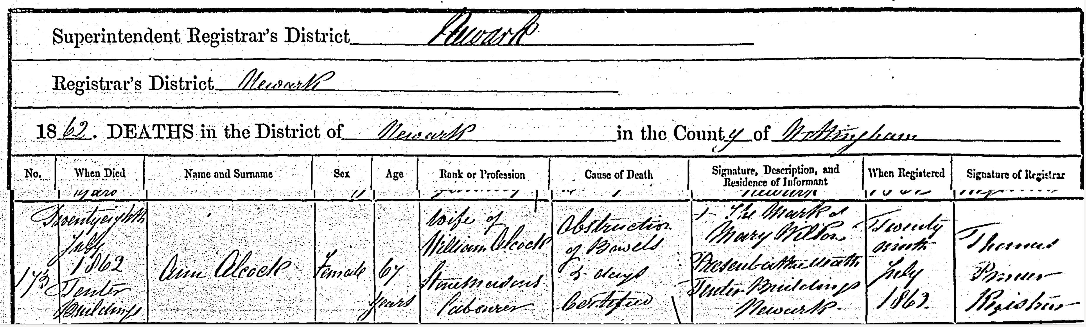 Death in the Registration District of Newark, Sub-district of Newark, Nottingham, 1862, no. 173. Died 28 Jul 1862 at Tenter buildings; Ann Alcock; Female; age 67; Wife of William Alcock, stonemason's labourer; cause of death was Obstruction of bowels, 5 days; certified. Informant was Mary Wilson; Tenter buildings, Newark; present at death; could not sign name. The death was registered 29 Jul 1862.