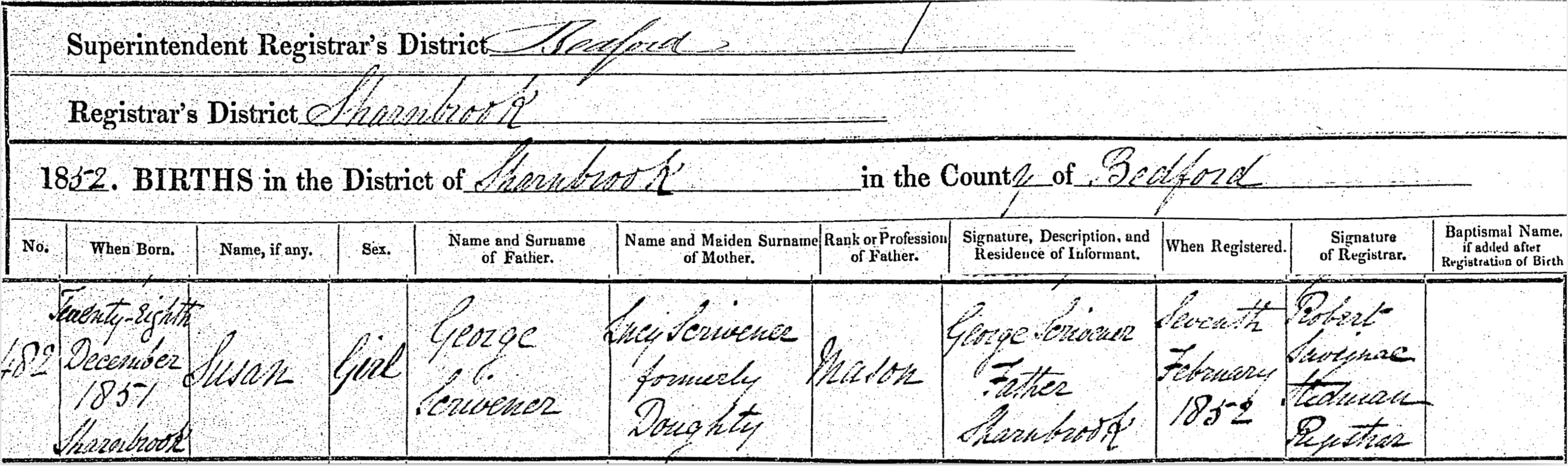 Birth in the Registration District of Bedford, Sub-district of Sharnbrook, Bedford, 1852, no. 482. Born 28 Dec 1851 at Sharnbrook; Susan Scrivener; Girl; father George Scrivener; mother Lucy Scrivener formerly Doughty. Occupation of father: Mason. Informant was George Scrivener; Father; Sharnbrook; signed name. The birth was registered 7 Feb 1852.