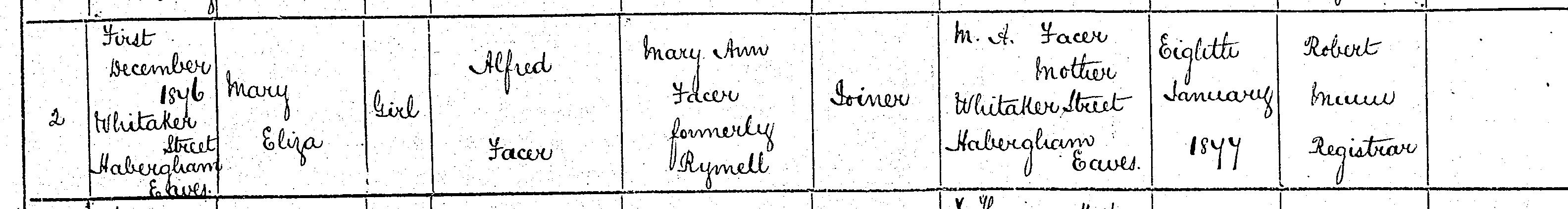 Birth in the Registration District of The Burnley Union, Lancashire, 1876, no. 2. Born 1 Dec 1876 at Whitaker Street, Habergham Eaves; Mary Eliza Facer; Girl; father Alfred Facer; mother Mary Ann Facer formerly Rymell. Occupation of father: Joiner. Informant was M.A. Facer; Mother; Whitaker Street, Habergham Eaves; signed name. The birth was registered 8 Jan 1877.