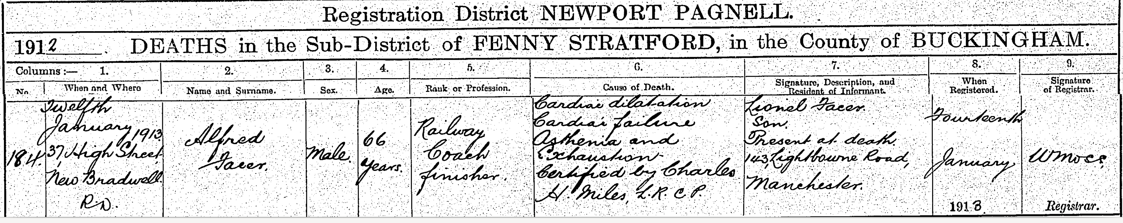 Death in the Registration District of Newport Pagnell, Sub-district of Fenny Stratford, Buckingham, 1912, no. 184. Died 12 Jan 1913 at 37 High Street, New Bradwell; Alfred Facer; Male; age 66; Railway coach finisher; cause of death was Cardiac dilation; cardiac failure; asthenia and exhaustion; certified. Informant was Lionel Facer; 143 Lightbourne Road, Manchester; present at death; signed name. The death was registered 14 Jan 1913.