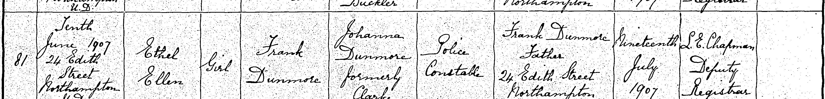 Birth in the Registration District of Northampton, Northampton, 1907, no. 81. Born 10 Jun 1907 at 24 Edith Street, Northampton; Ethel Ellen Dunmore; Girl; father Frank Dunmore; mother Johanna Dunmore formerly Clarke. Occupation of father: Police Constable. Informant was Frank Dunmore; Father; 24 Edith Street, Northampton; signed name. The birth was registered 19 Jul 1907.