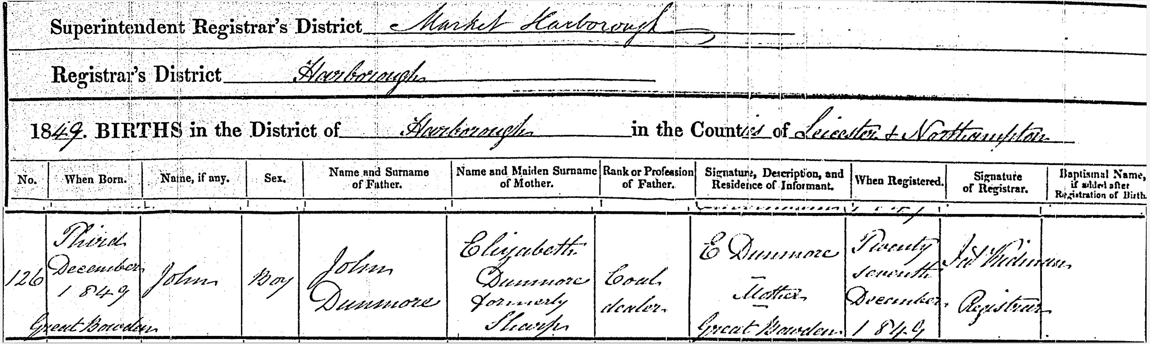 Birth in the Registration District of Market Harborough, Sub-district of Harborough, Leicester and Northampton, 1849, no. 126. Born 3 Dec 1849 at Great Bowden; John Dunmore; Boy; father John Dunmore; mother Elizabeth Dunmore formerly Sharp. Occupation of father: Coal Dealer. Informant was E Dunmore; Mother; Great Bowden; signed name. The birth was registered 27 Dec 1849.