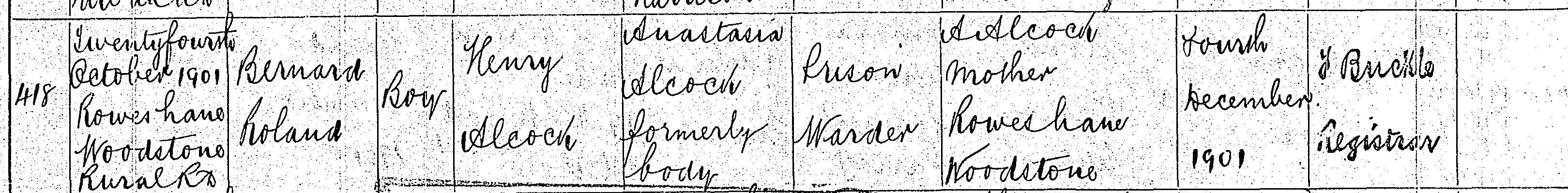 Birth in the Registration District of Peterborough, Northampton, 1901, no. 418. Born 24 Oct 1901 at Rowes Lane, Woodstone; Bernard Roland Alcock; Boy; father Henry Alcock; mother Anastasia Alcock formerly Cody. Occupation of father: Prison Warder. Informant was A Alcock; Mother; Rowes Lane, Woodstone; signed name. The birth was registered 4 Dec 1901.