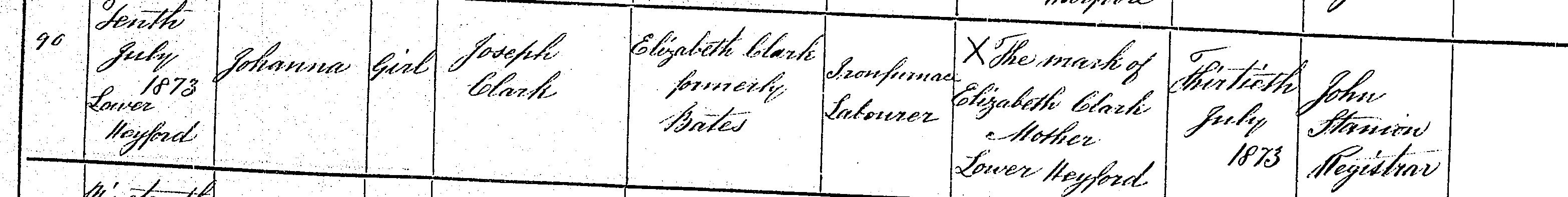 Birth in the Registration District of Northampton Union, Northampton, 1873, no. 90. Born 10 Jul 1873 at Lower Heyford; Johanna Clark; Girl; father Joseph Clark; mother Elizabeth Clark formerly Bates. Occupation of father: Ironfurnace Labourer. Informant was Elizabeth Clark; Mother; Lower Heyford; could not sign name. The birth was registered 30 Jul 1873.
