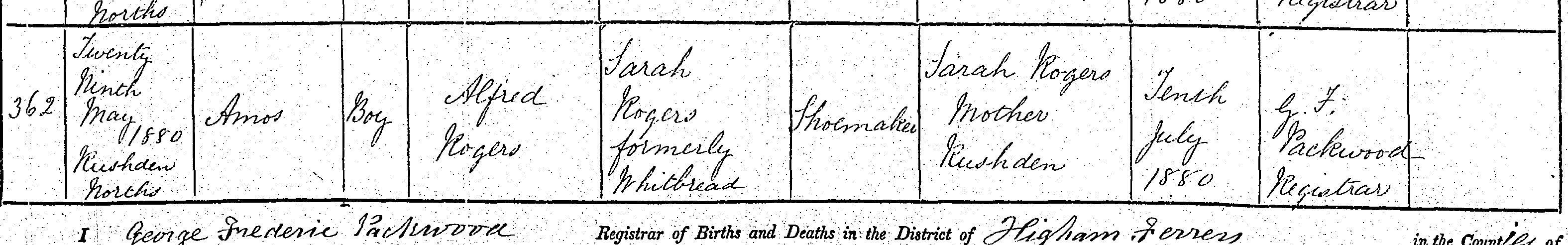 Birth in the Registration District of Wellingborough, Northamptonshire, 1880, no. 362. Born 29 May 1880 at Rushden, Northamptonshire; Amos Rogers; Boy; father Alfred Rogers; mother Sarah Rogers formerly Whitbread. Occupation of father: Shoemaker. Informant was Sarah Rogers; Mother; Rushden; signed name. The birth was registered 10 Jul 1880.