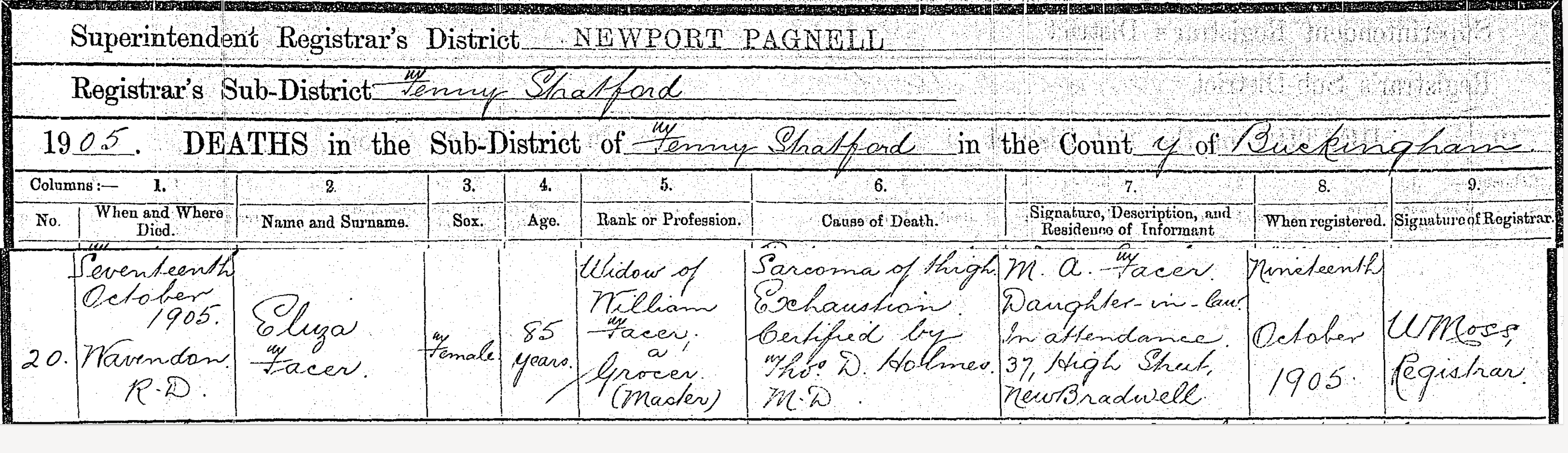 Death in the Registration District of Newport Pagnell, Sub-district of Fenny Stratford, Buckingham, 1905, no. 20. Died 17 Oct 1905 at Wavendon; Eliza Facer; Female; age 85; Widow of William Facer, a grocer (master); cause of death was Sarcoma of thigh; exhaustion; certified. Informant was M.A. Facer; 37 High Street, New Bradwell; present at death; signed name. The death was registered 19 Oct 1905.