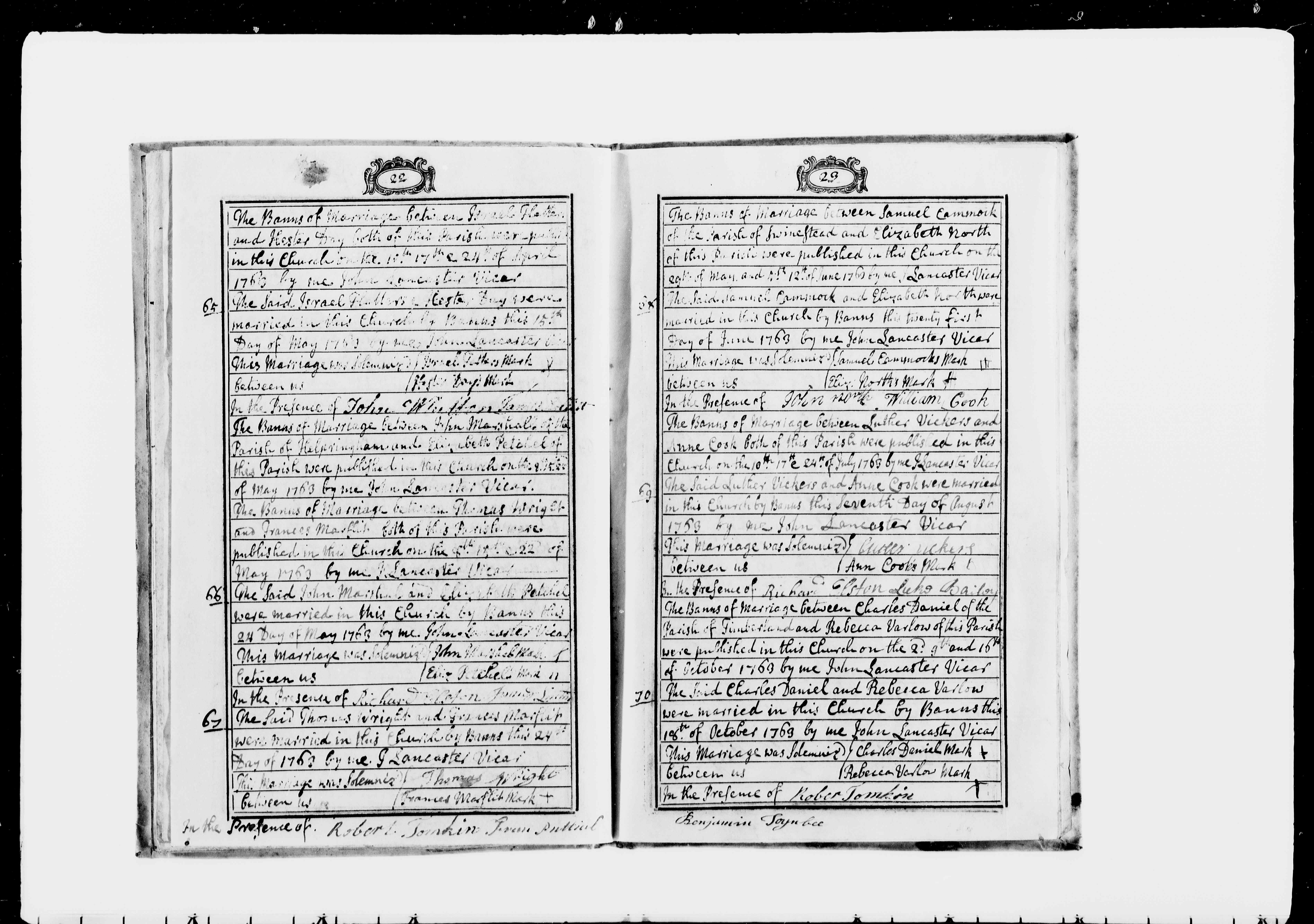 Charles Daniel, abode the Parish of Timberland and Rebecca Varlow, abode This Parish. Married by Banns. Groom could not sign name. Bride could not sign name. Witness: Rober Tomkin (signed). Witness: Benjamin Toynbee (signed).