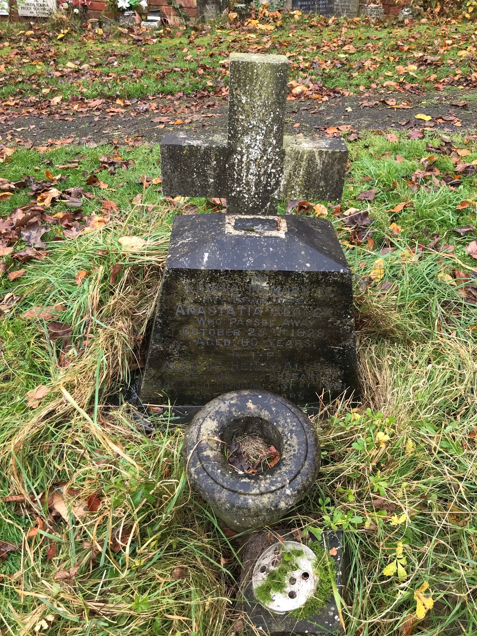 IN LOVING MEMORY OF MY DEAR WIFE ANASTATIA ALCOCK WHO PASSED AWAY OCTOBER 25TH 1929 AGED 60 YEARS R.I.P.ALSO OF HENRY ALCOCK HER BELOVED HUSBAND WHO DIED JANUARY 31ST 1931 AGED 69 YEARS