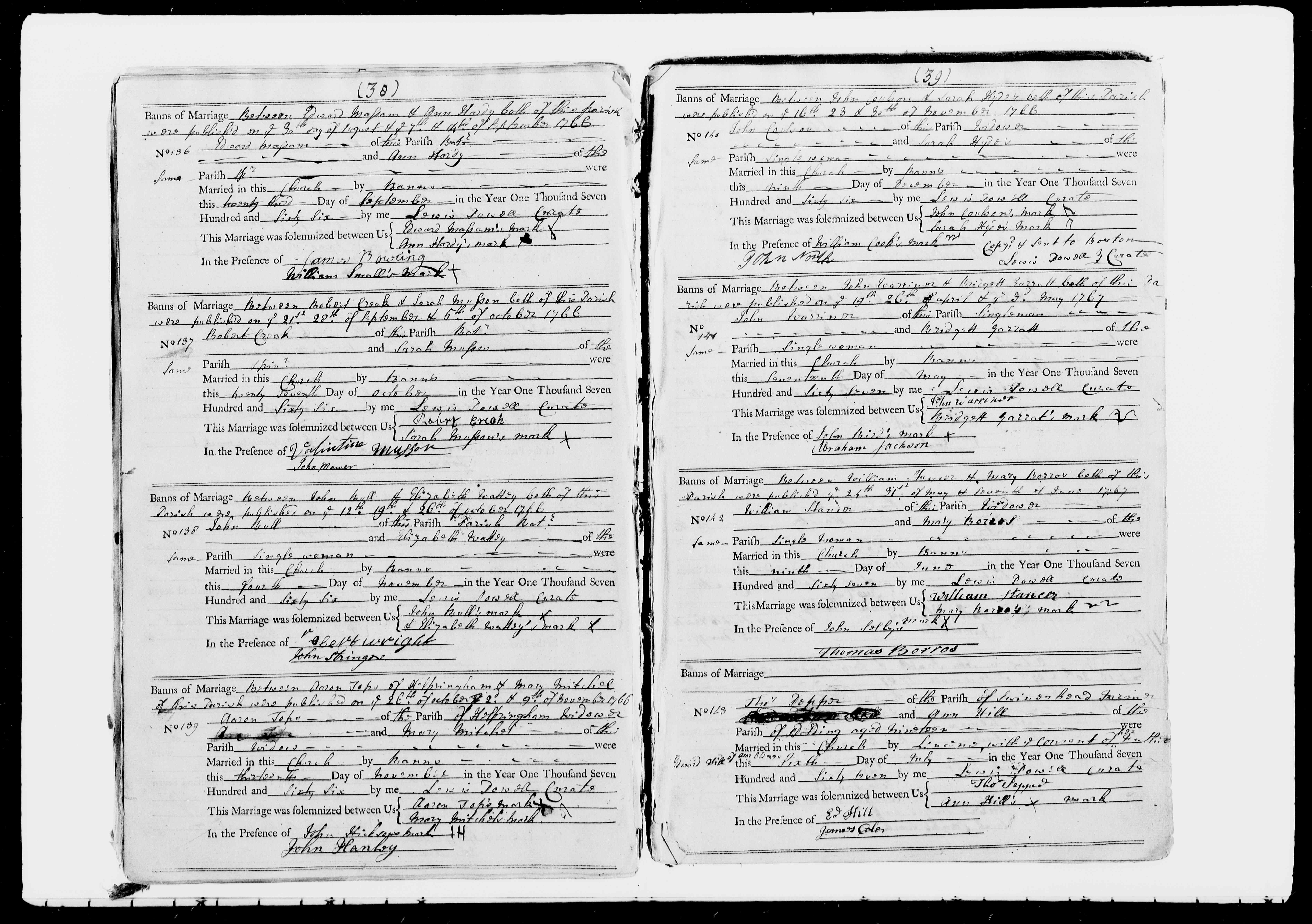 Marriage entry for Robert Creak and Sarah Musson, 27 Oct 1766, Page 38, No 137
