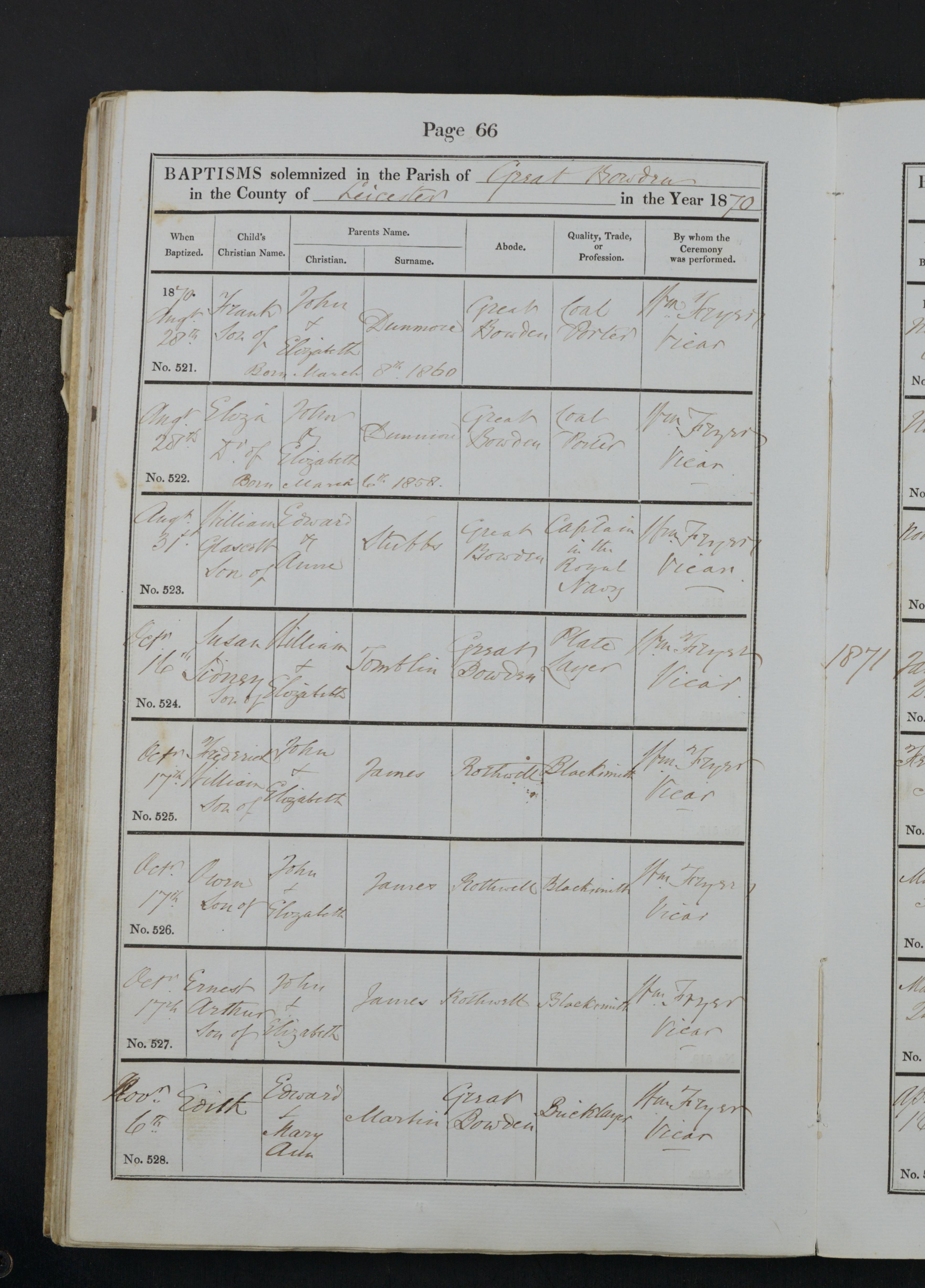 Parish Registers of St Peter & St Paul, Great Bowden, Leicestershire; Baptism entry for Frank Dunmore, 28 Aug 1870, Page 66, No 521.