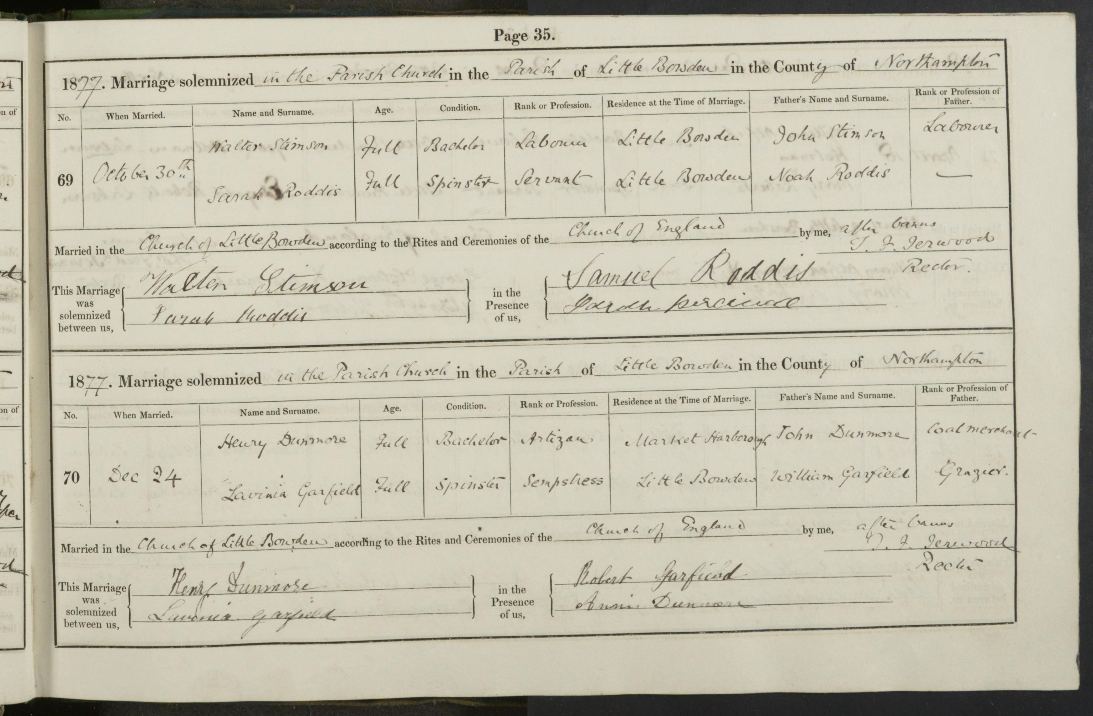 Parish Registers of St. Nicholas, Little Bowden, Leicestershire; Marriage entry for Henry Dunmore and Lavinia Garfield, 24 Dec 1877, Page 35, No 70.