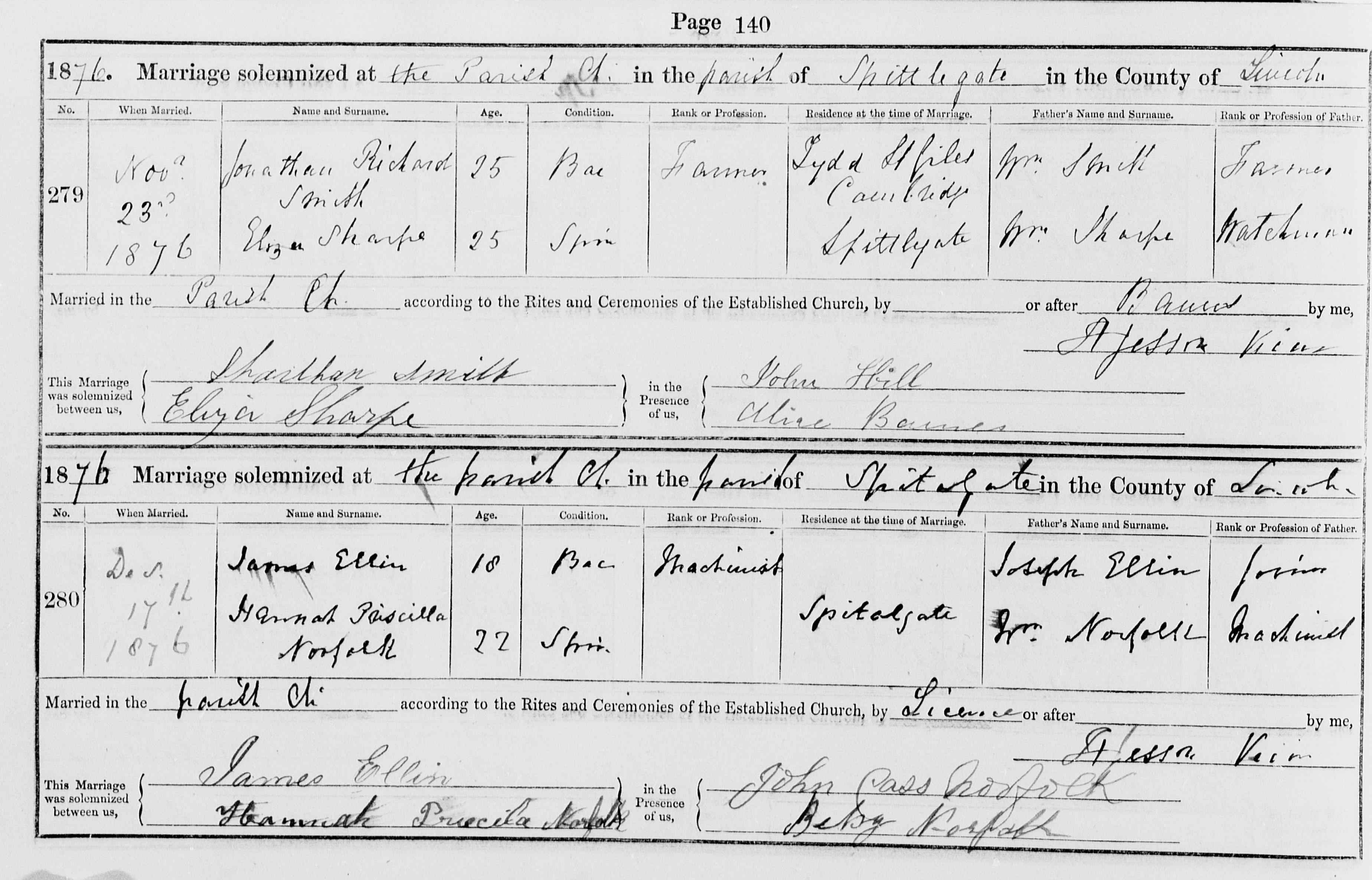 Parish Registers of St. John, Spittlegate, Lincolnshire; Marriage entry for Jonathan Richard Smith and Eliza Sharpe, 23 Nov 1876, Page 140, No 279.