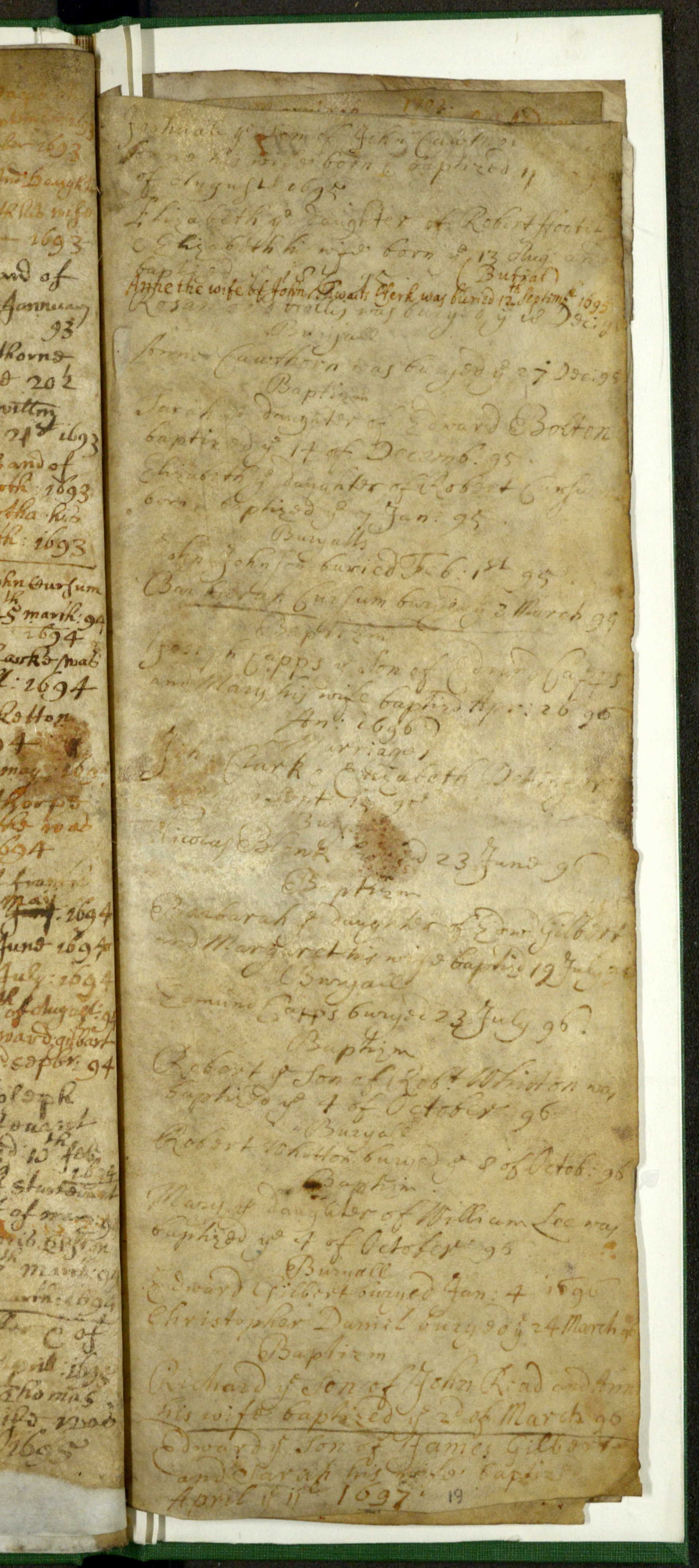 Parish Registers of St. Giles, Cromwell, Nottinghamshire; Baptism of Joshua Camomile, 11 Aug 1695.