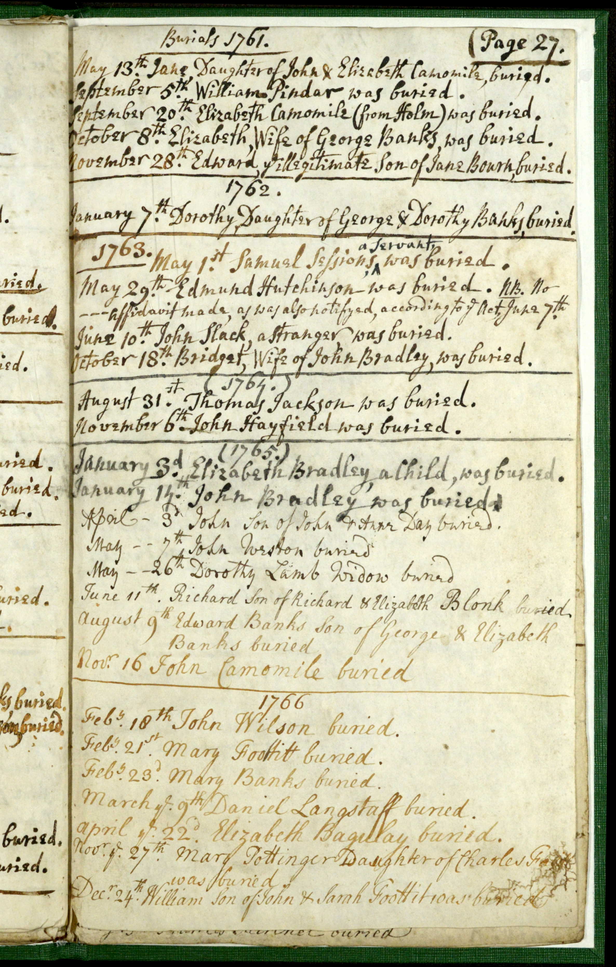 Parish Registers of St. Giles, Cromwell, Nottinghamshire; Burial of Daniel Langstaff, 9 Mar 1766.
