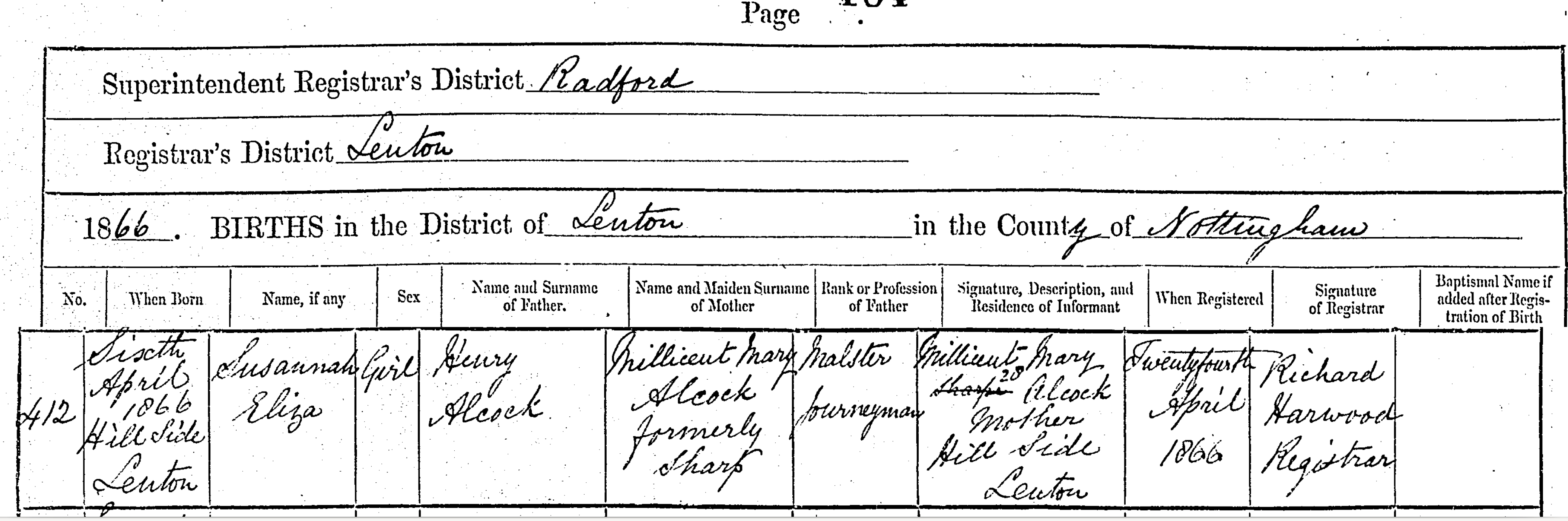 Birth in the Registration District of Radford, Sub-district of Lenton, Nottingham, 1866, no. 412. Born 6 Apr 1866 at Hill Side, Lenton; Susannah Eliza Alcock; Girl; father Henry Alcock; mother Millicent Mary Alcock formerly Sharp. Occupation of father: Maltster Journeyman. Informant was Millicent Mary Alcock; Mother; Hill Side, Lenton; signed name. The birth was registered 24 Apr 1866.