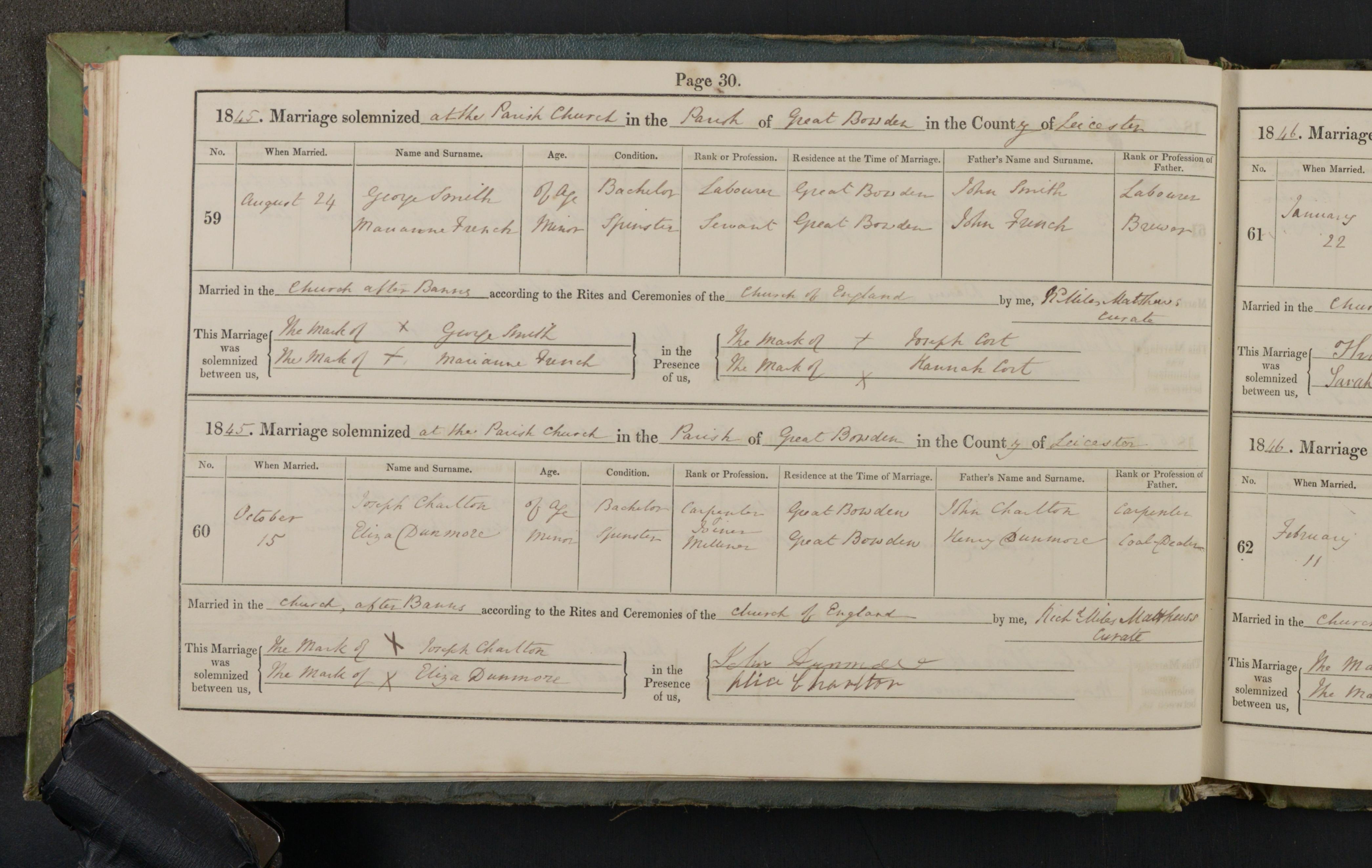 Parish Registers of St Peter & St Paul, Great Bowden, Leicestershire; Marriage entry for Joseph Charlton and Eliza Dunmore, 15 Oct 1845, Page 30, No 60.