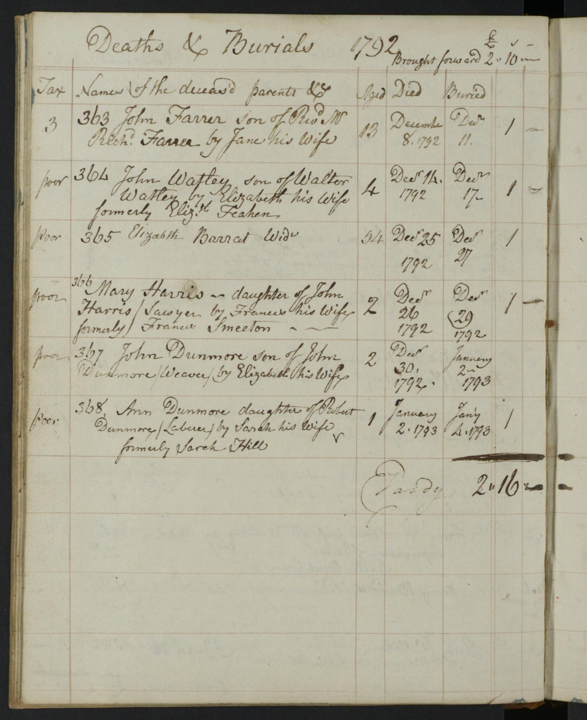 John Dunmore son of John Dunmore/Weaver/ by Elizabeth his wife, age 2, died Dec 30, 1792