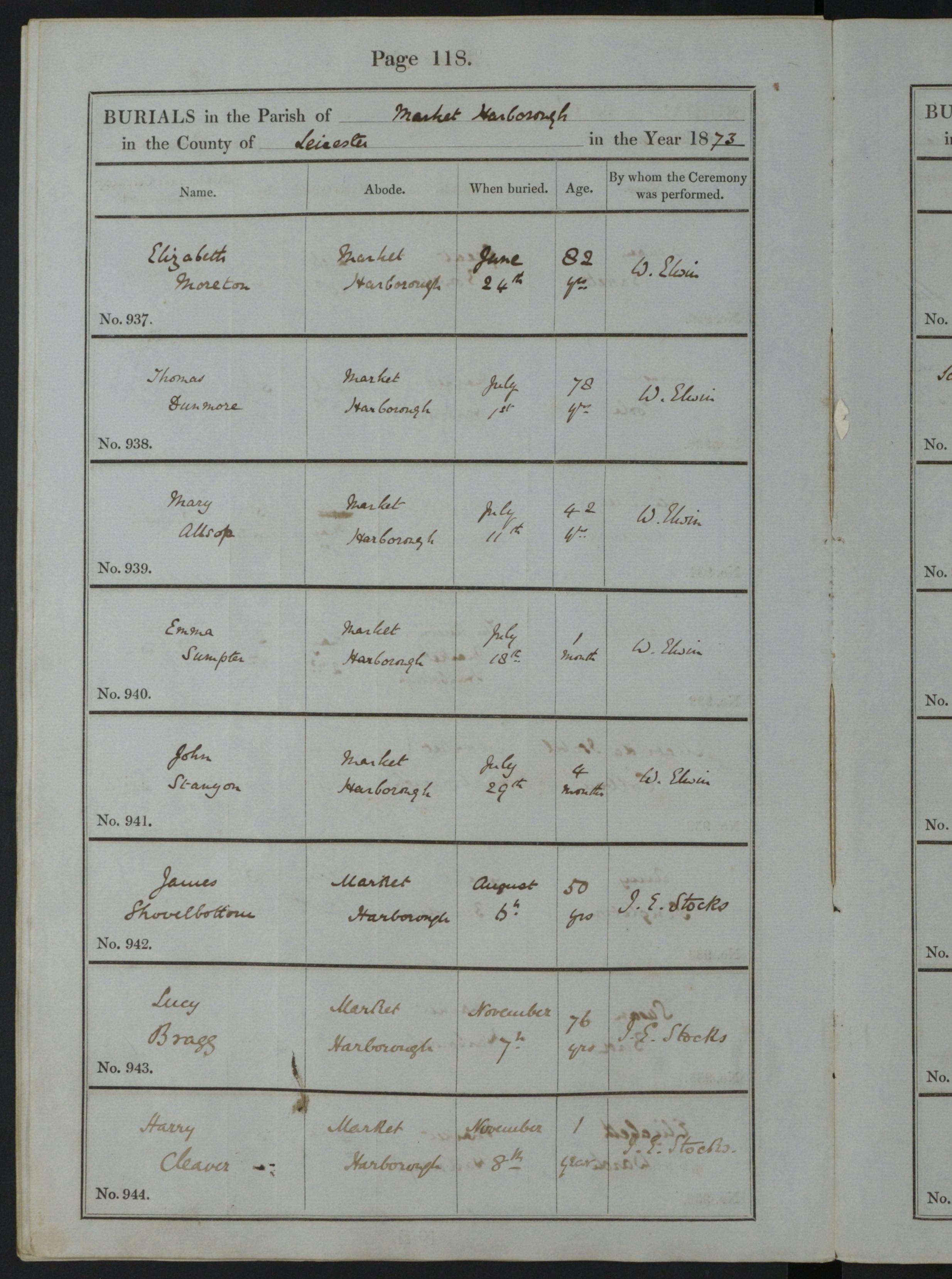 Parish Registers of St Dionysius, Market Harborough, Leicestershire; Burial entry for Thomas Dunmore, 1 Jul 1873, Page 118, No 938.