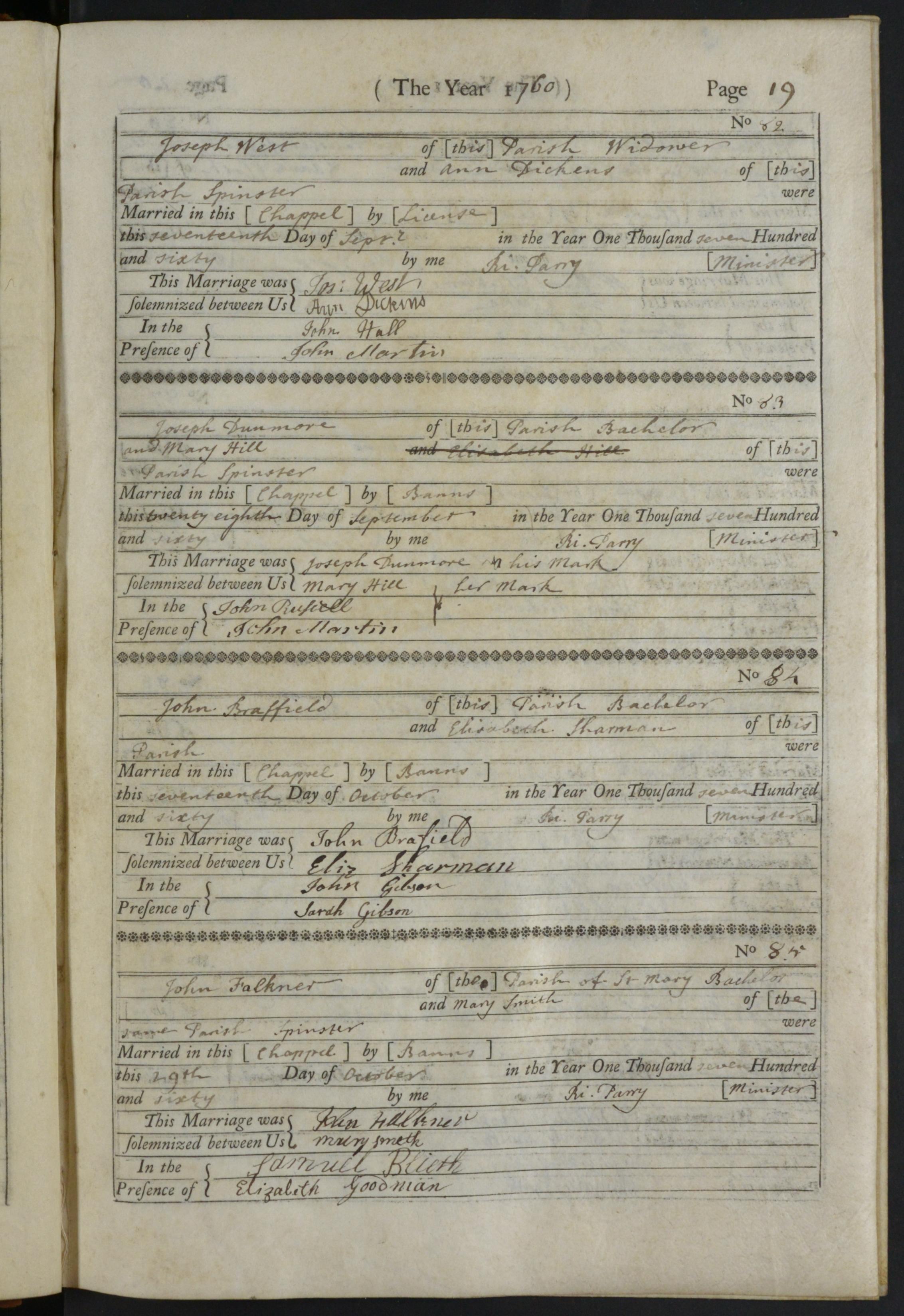 Marriage entry for Joseph Dunmore and Mary Hill, 8 Sep 1760, Page 19, No 83
