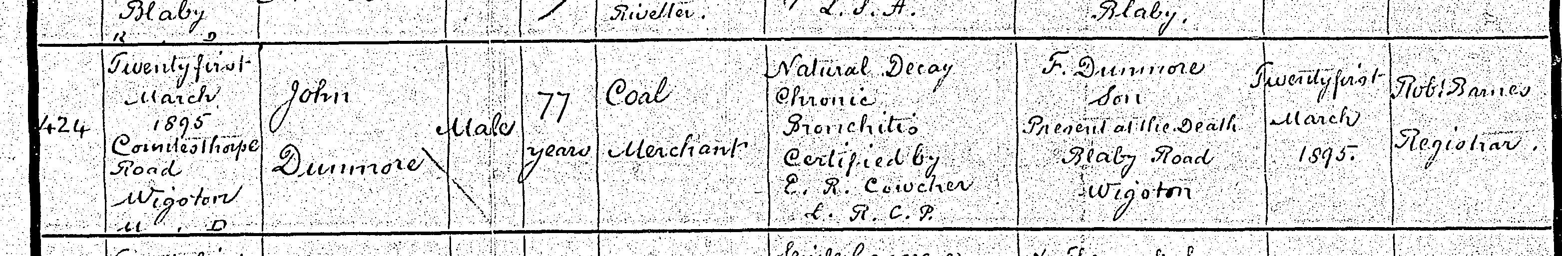 Death in the Registration District of Blaby, Leicestershire, 1895, no. 424. Died 21 Mar 1895 at Countesthorpe Road, Wigston; John Dunmore; Male; age 77; Coal Merchant. Cause of death: Natural Decay, Chronic Bronchitis, certified. Informant was F. Dunmore (signed name); relation: Son; residing at Blaby Road; present at death. The death was registered 21 Mar 1895.