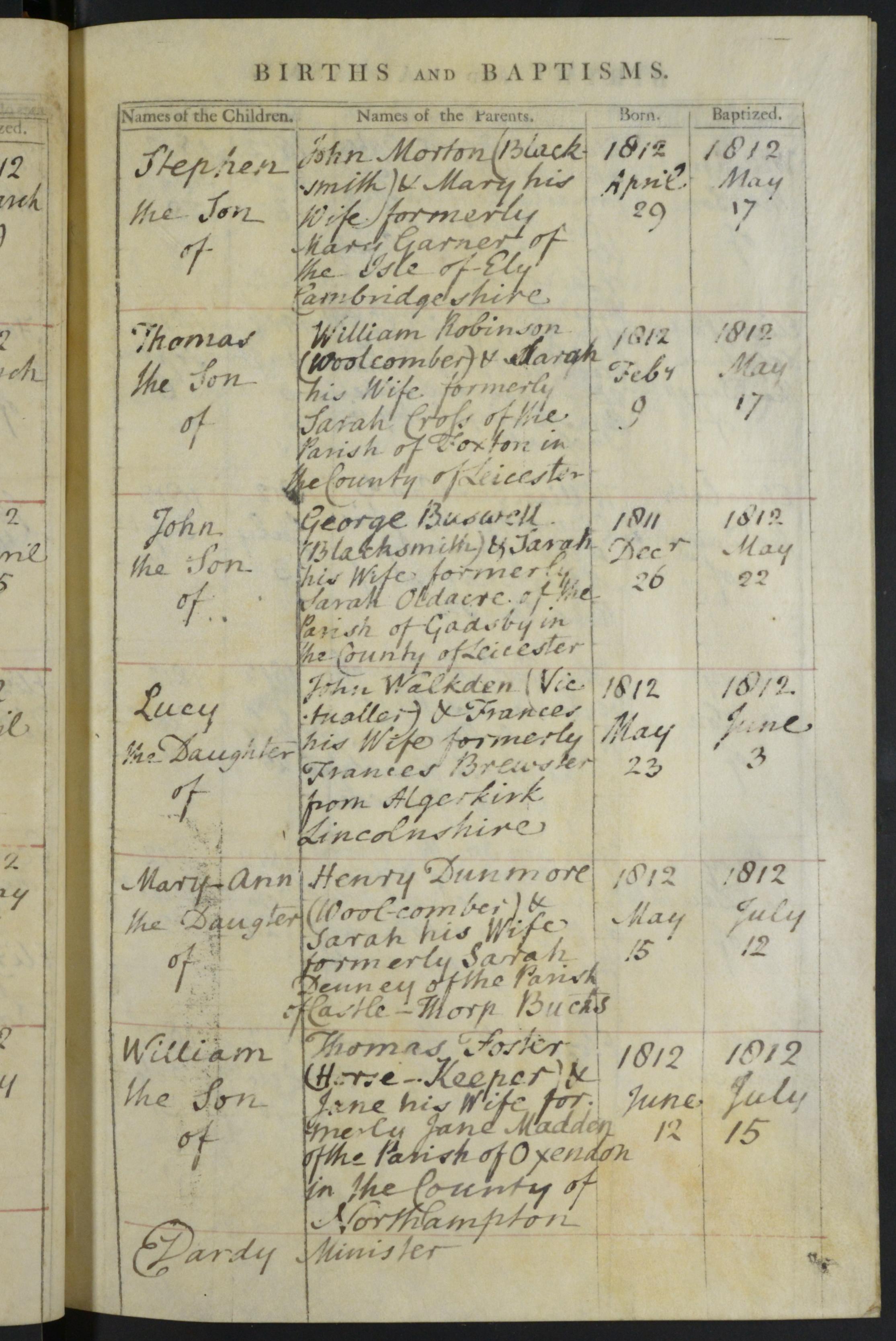 Mary-Ann the daughter of Henry Dunmore (Wool Comber) & Sarah his Wife formerly Sarah Denney of the Parish of Castle-thorp Bucks, born 15 May 1812