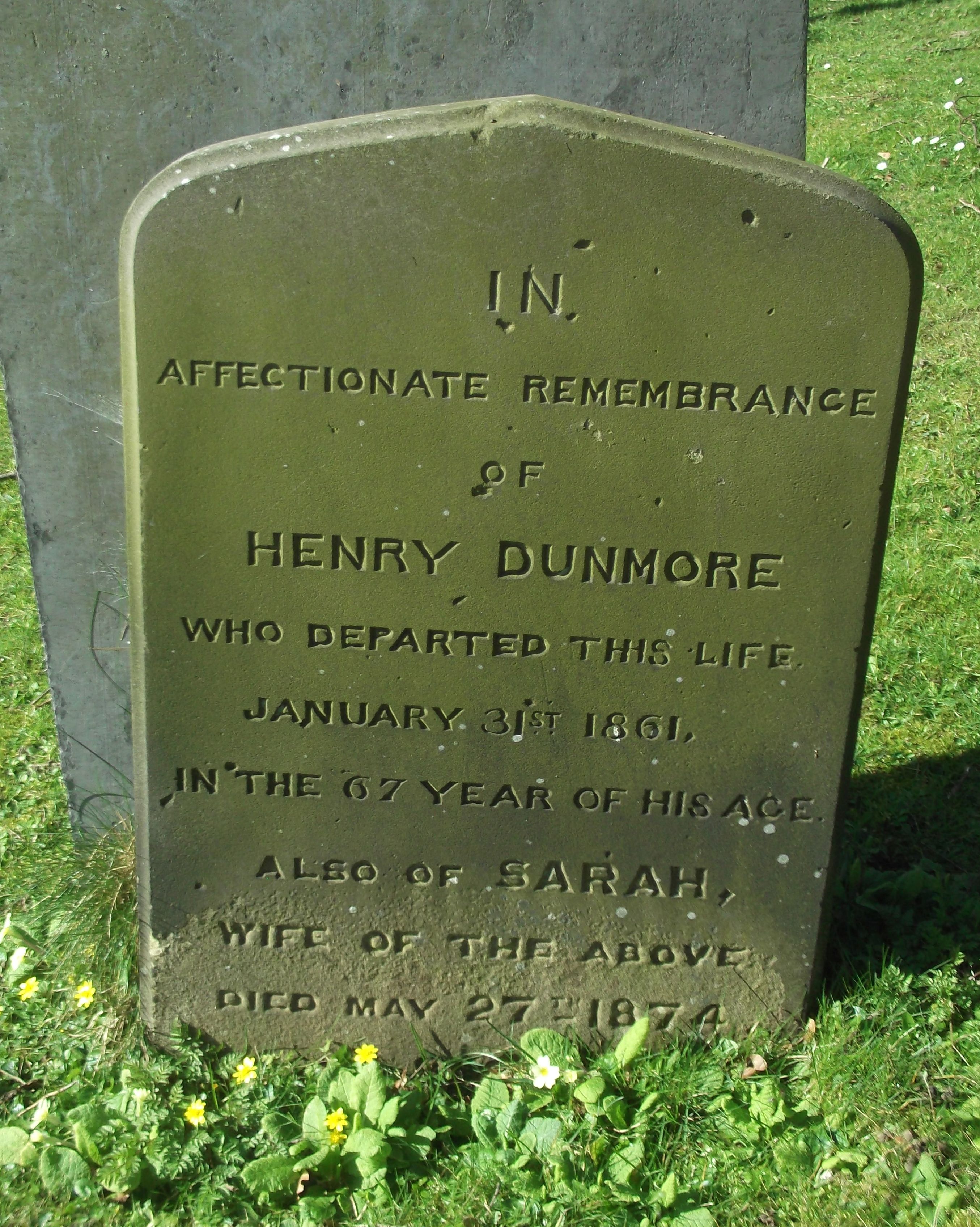 IN AFFECTIONATE REMEMBRANCE OF HENRY DUNMORE WHO DEPARTED THIS LIFE JANUARY 31st 1861, IN THE 67 YEAR OF HIS AGE ALSO OF SARAH WIFE OF THE ABOVE DIED MAY 27th 1874