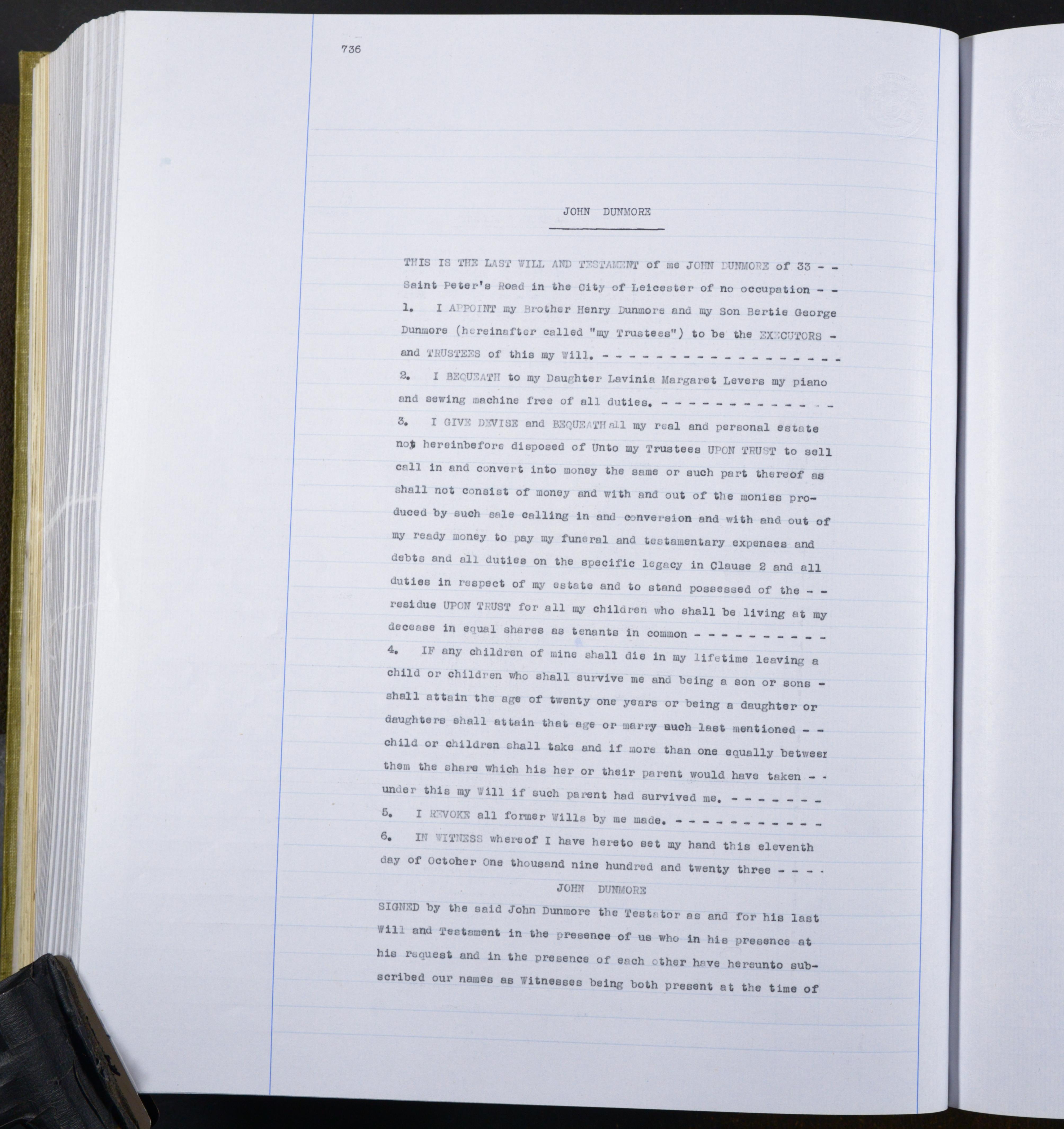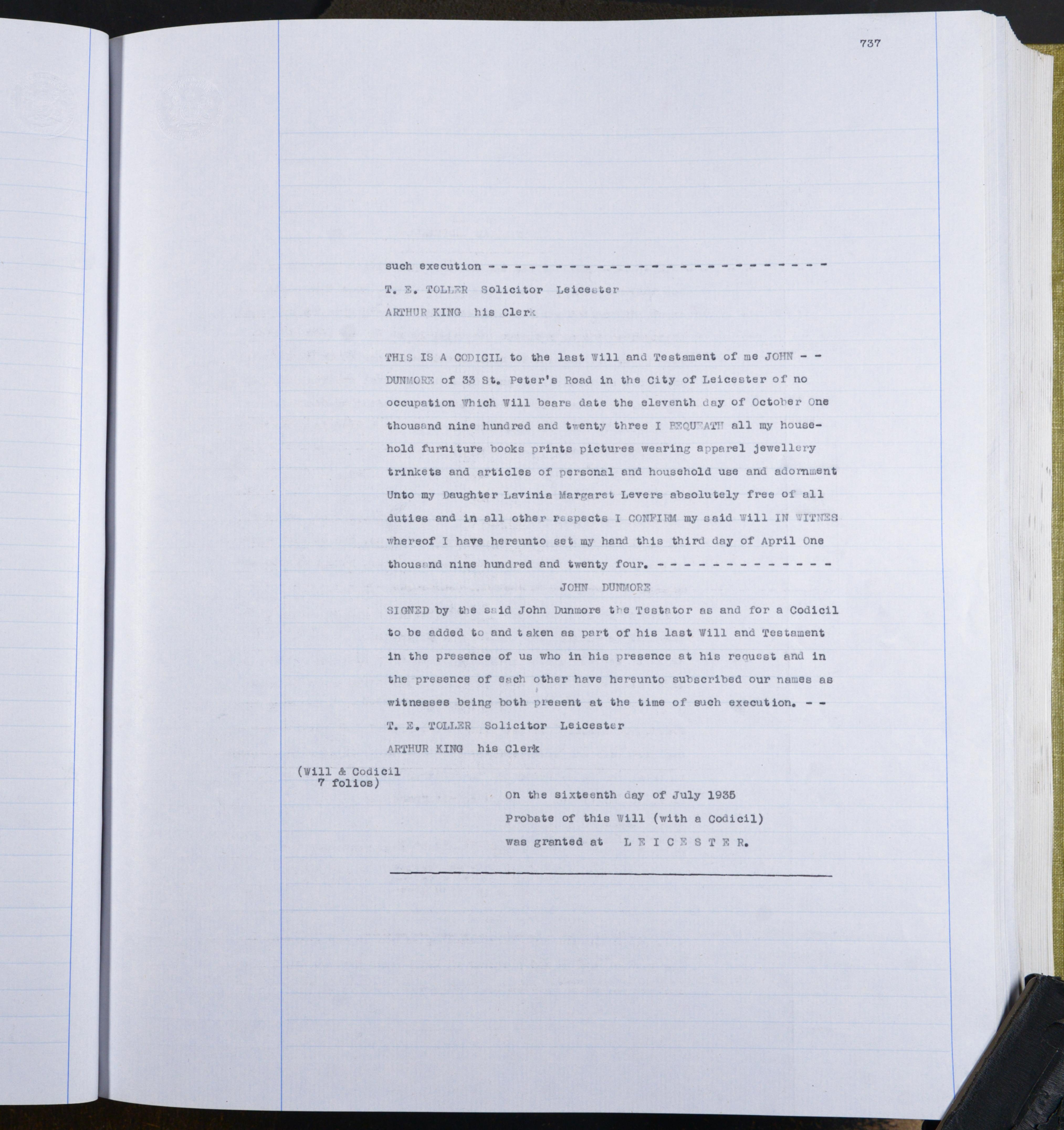 - John Dunmore★ probate was read on 16 Jul, 1935 at the Leicester Probate Registry, Leicestershire, England