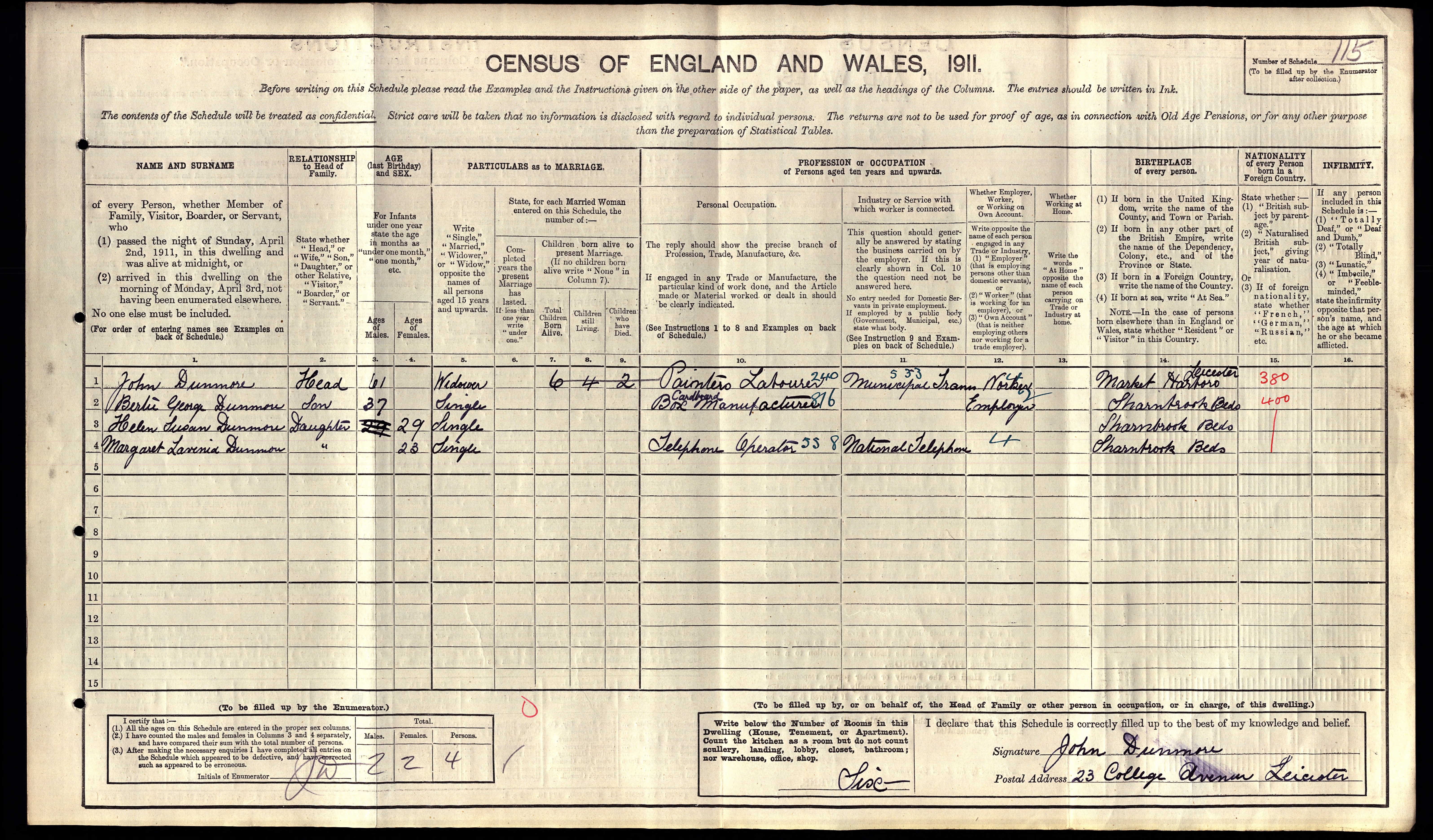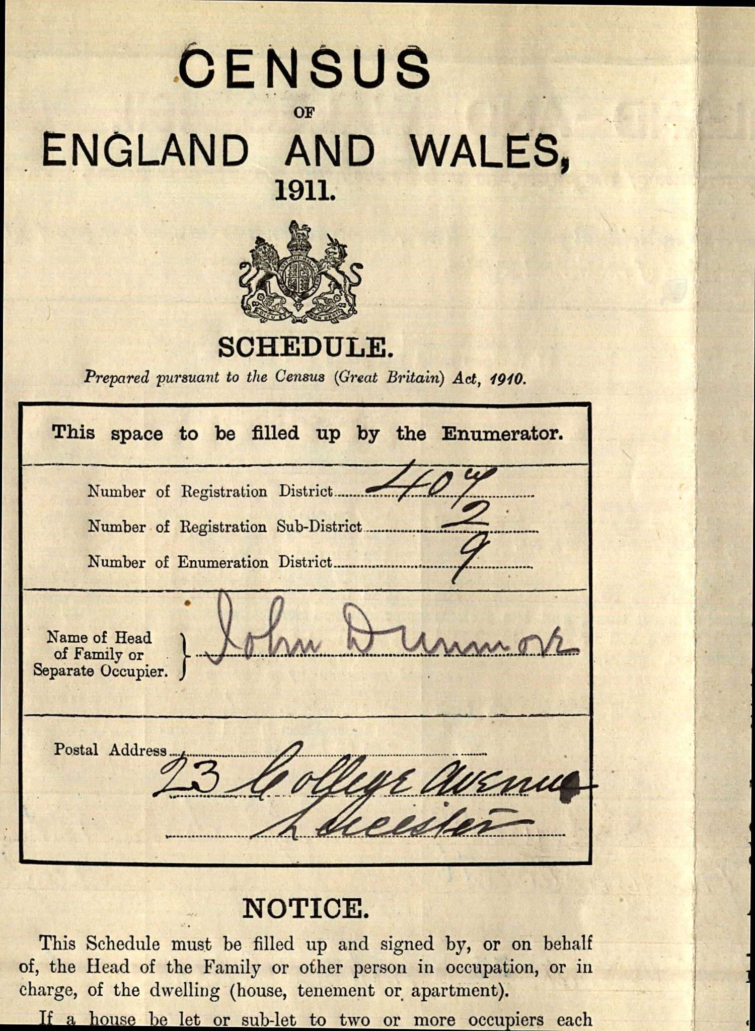 - was recorded in the census on 2 Apr, 1911 at 23 College Avenue, Leicester, Leicestershire, England