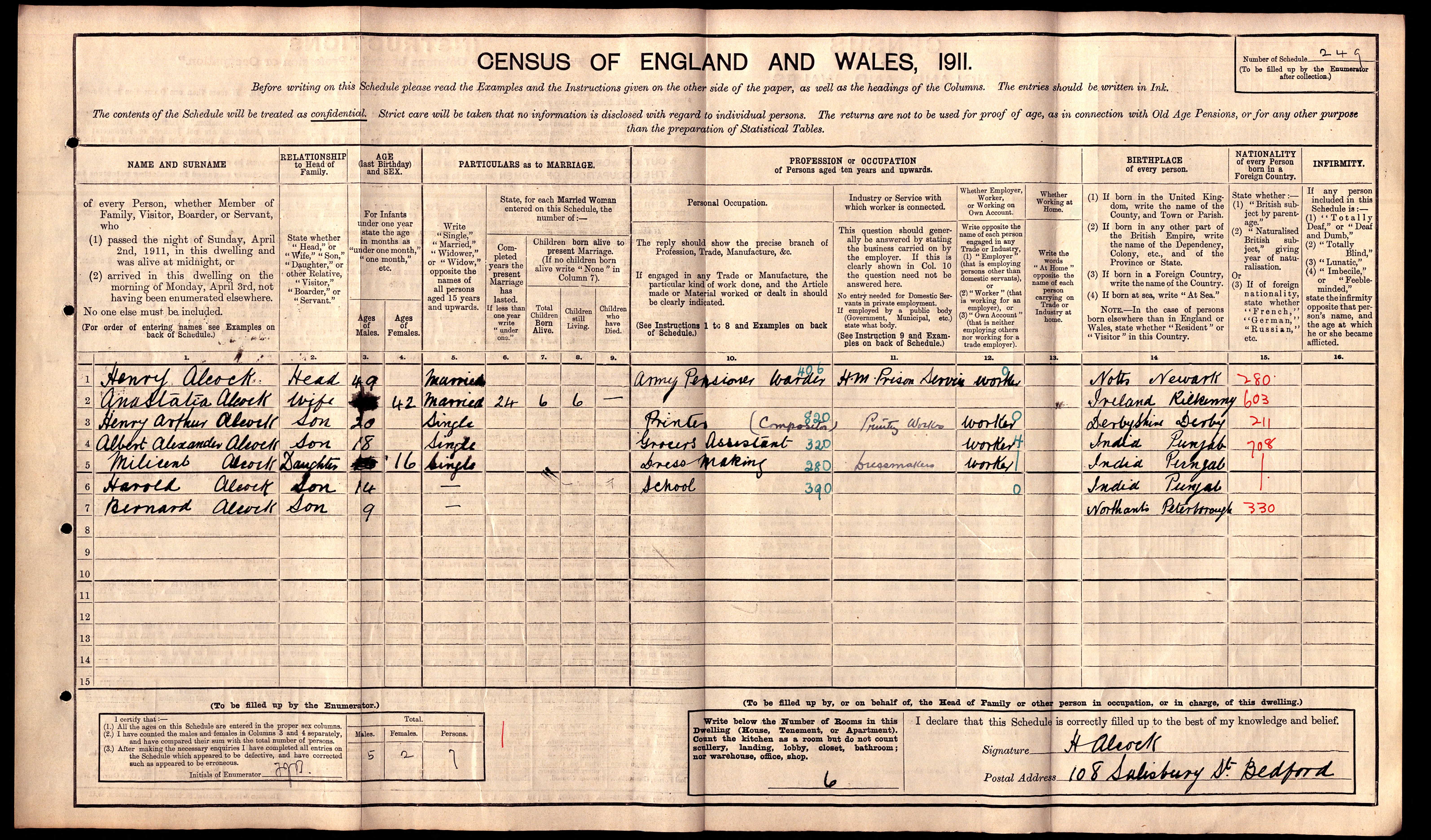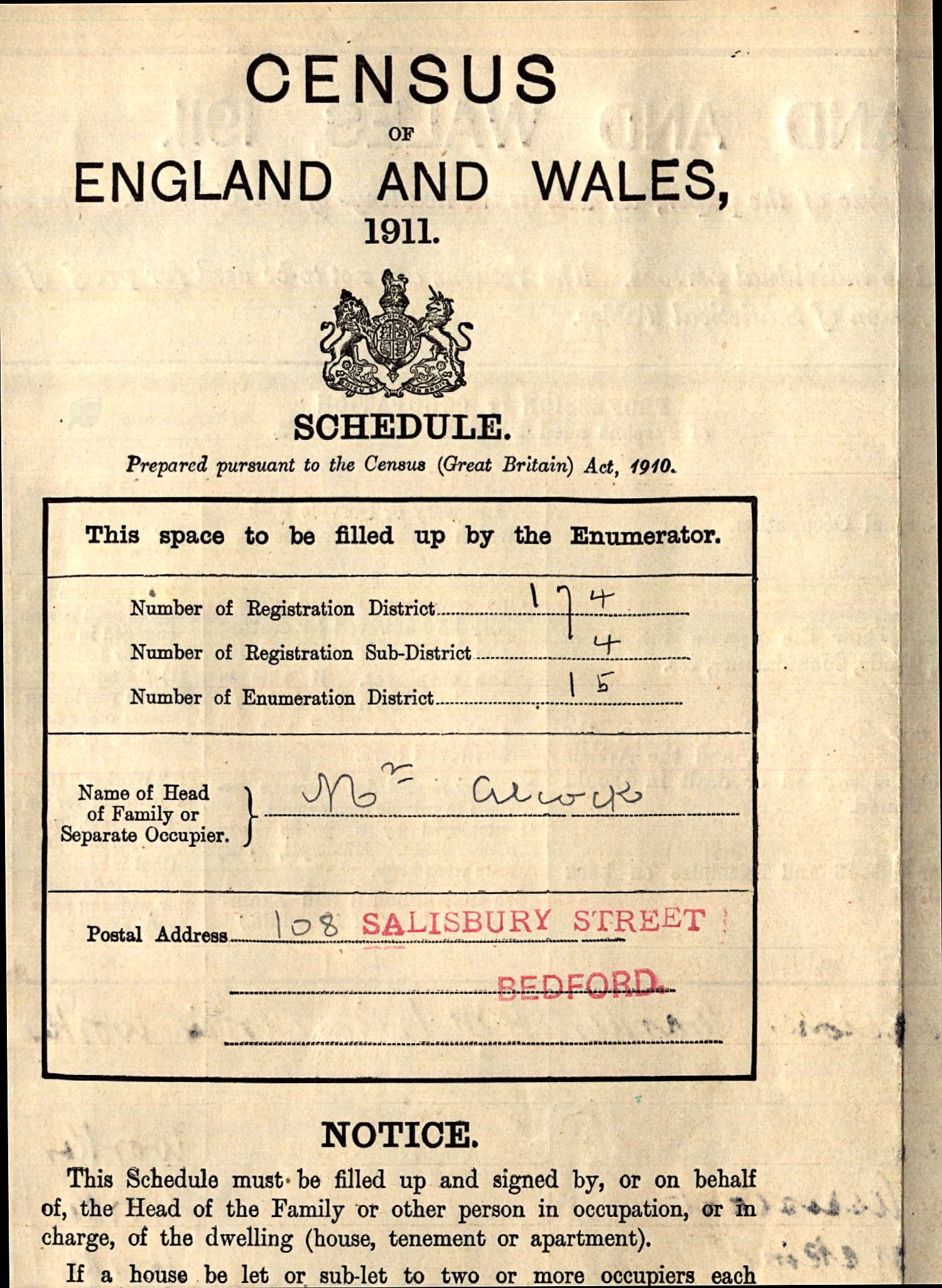 - was recorded in the census on 2 Apr, 1911 at 108 Salisbury Street, Bedford, Bedfordshire, England